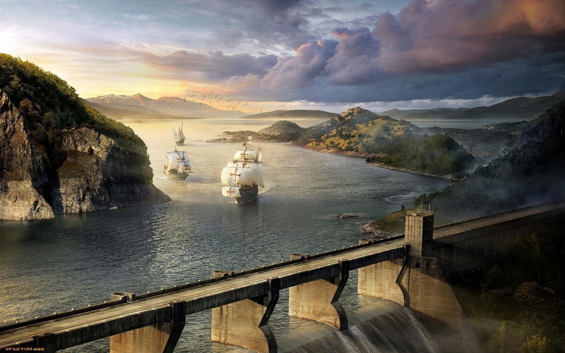 Su sfondo arancione nuvole bianche, ponte nero, montagne e onde