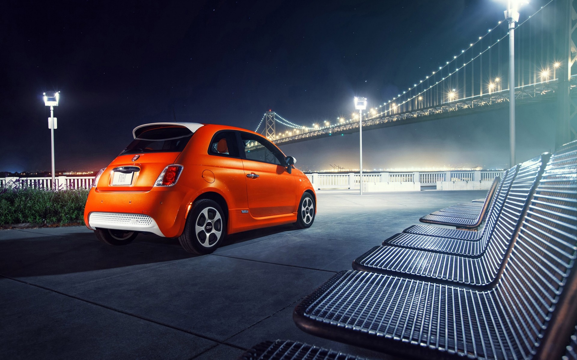 Auto arancione parcheggiata sul lungomare con vista sul ponte
