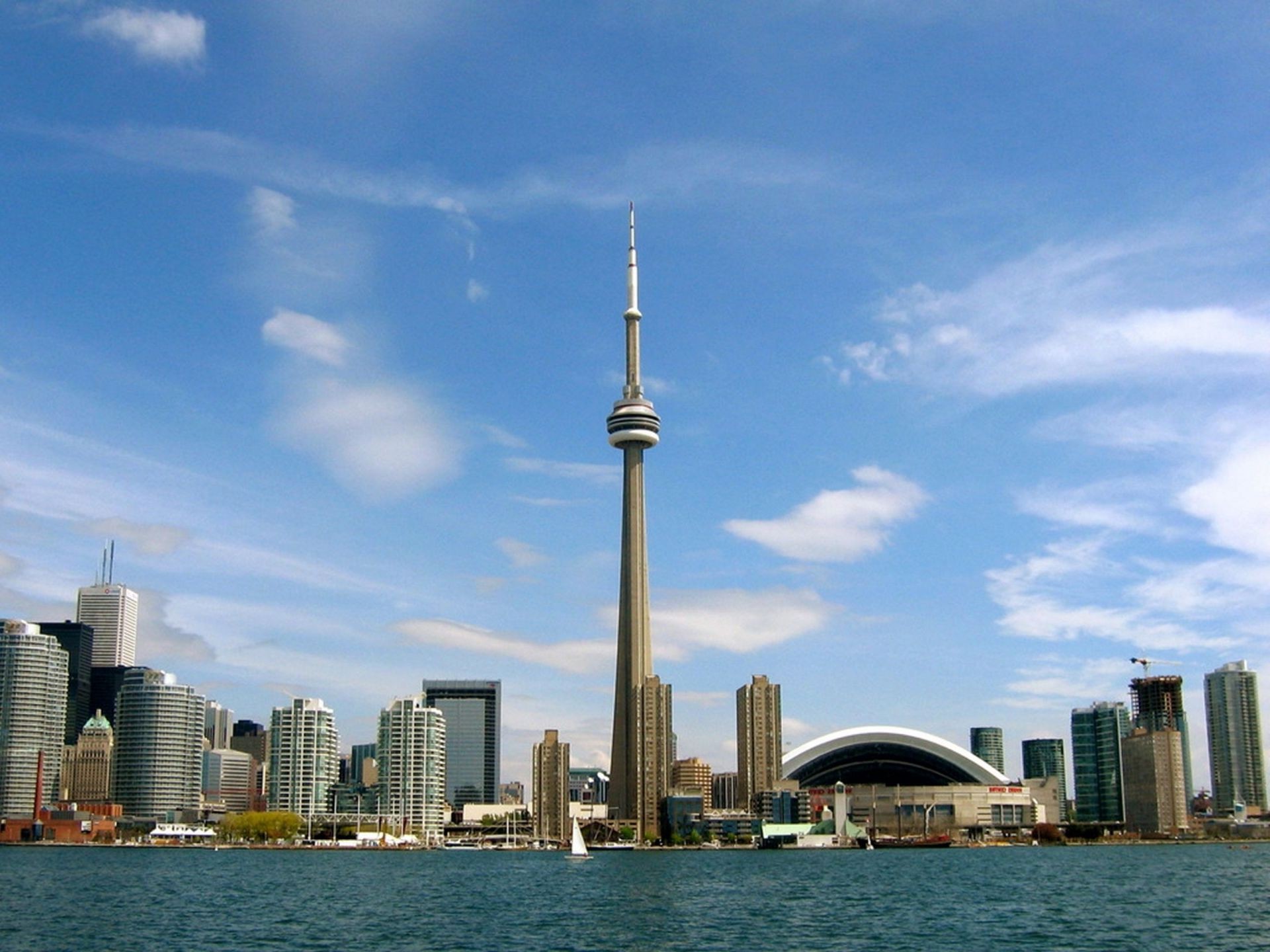 I grattacieli si riflettono nell'acqua alla luce della Luna
