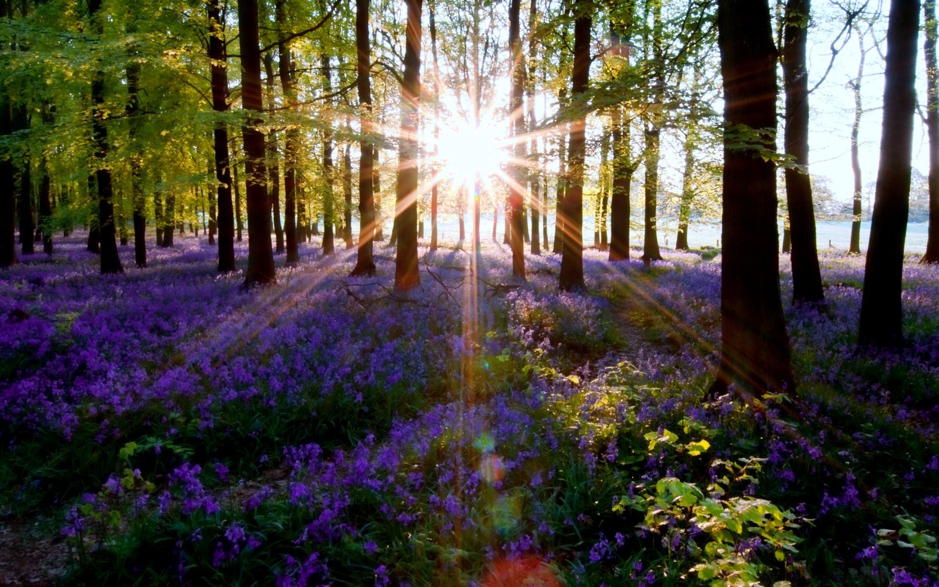Il sole splende attraverso i tronchi degli alberi sui fiori