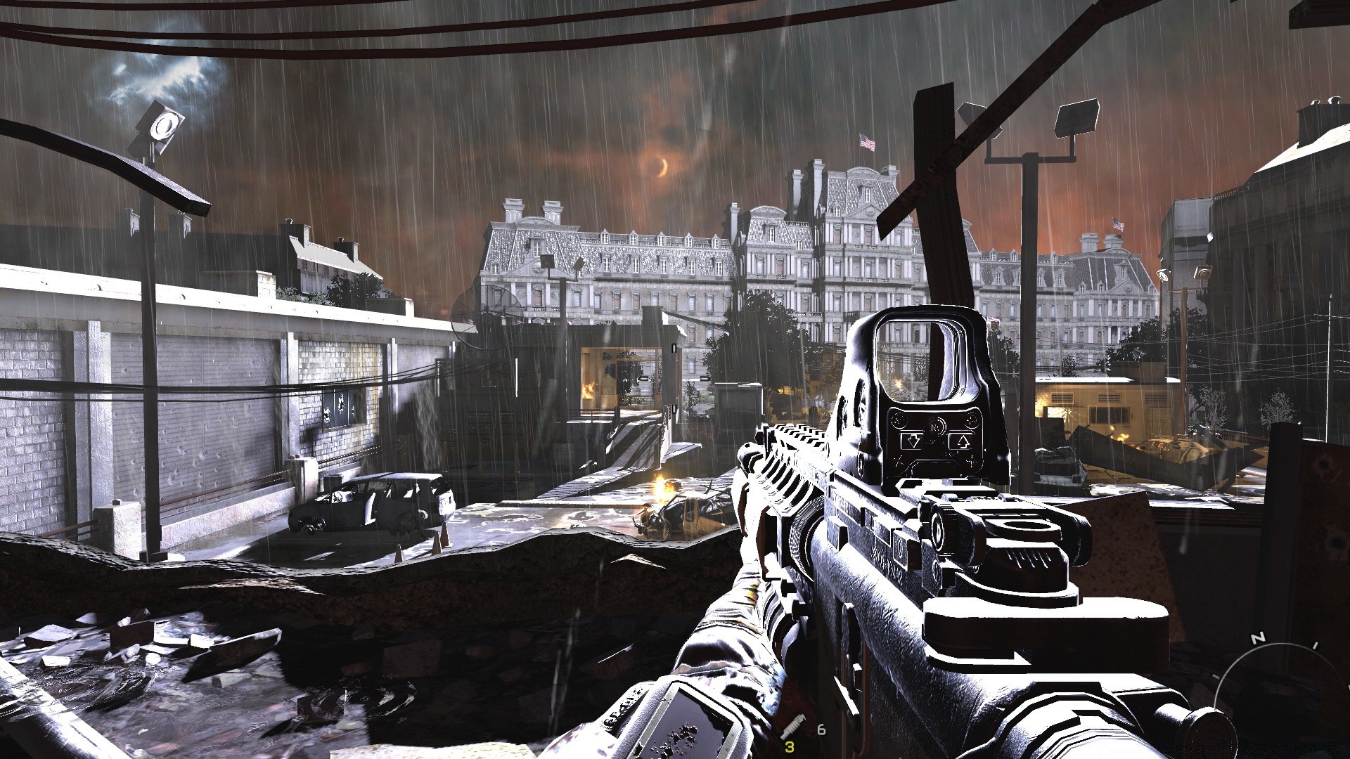 Uomo in piedi con una mitragliatrice sullo sfondo di un'esplosione