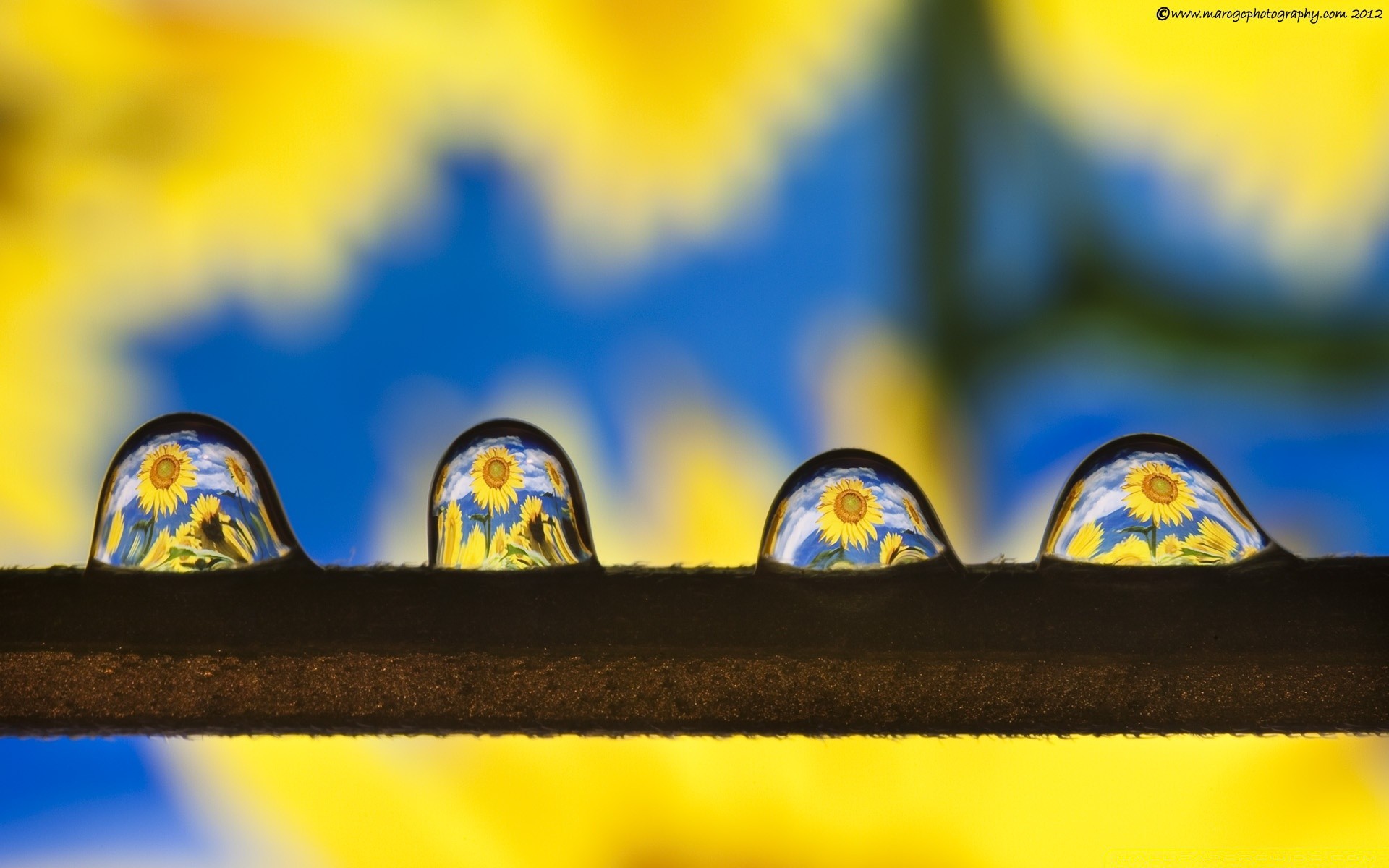 Immagine in una goccia. Fotografia macro. Girasole in una goccia