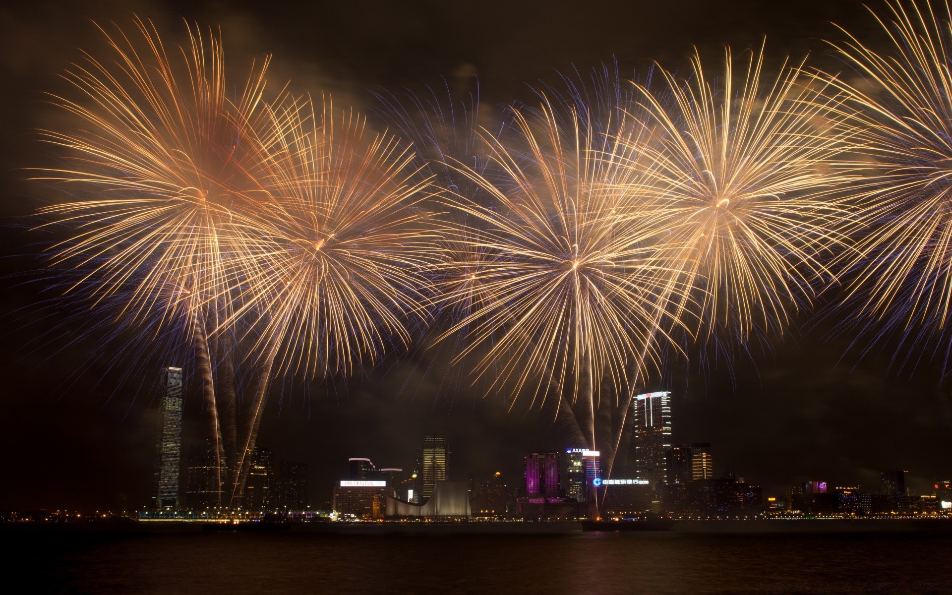Festival dei fuochi D'artificio in Asia sopra i grattacieli