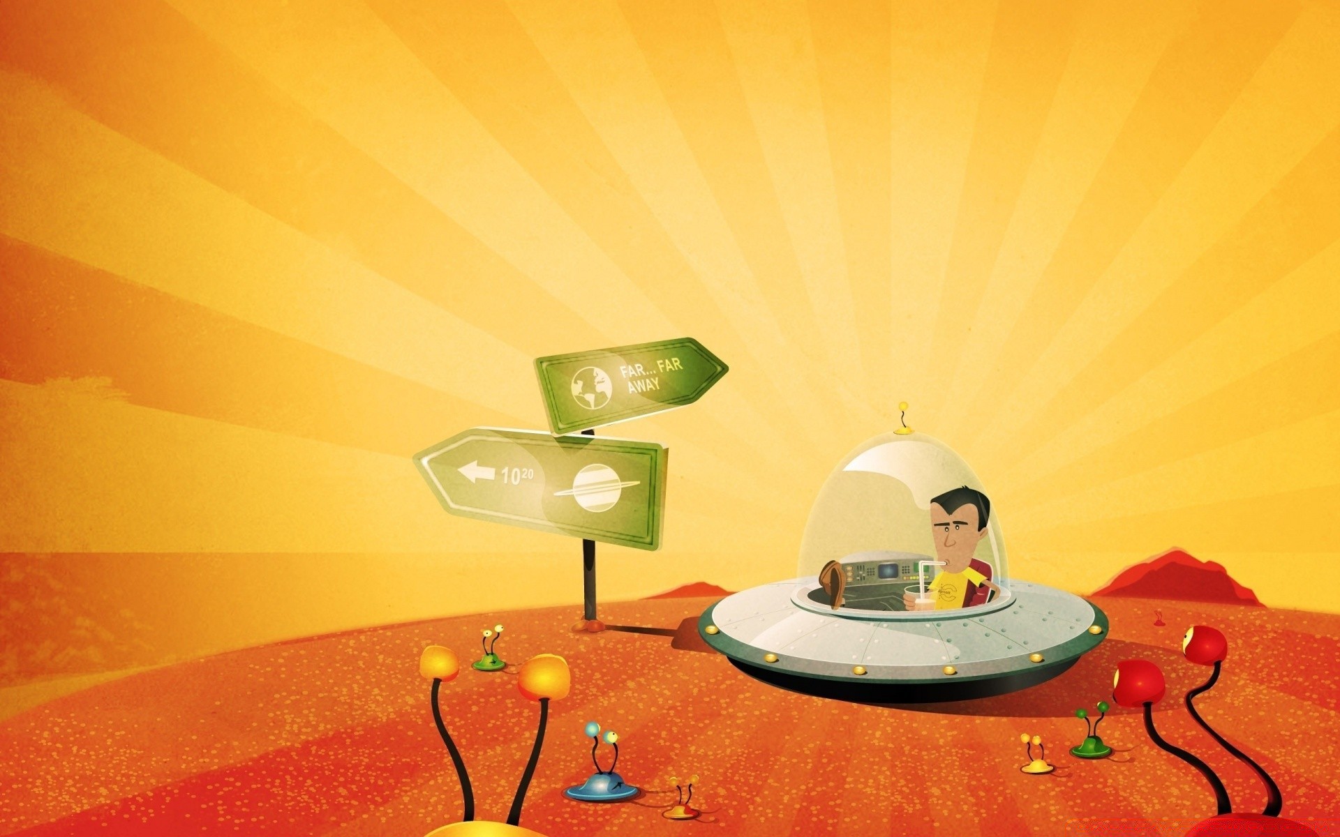 Un uomo dei cartoni animati in un disco volante in piedi su un campo rosso