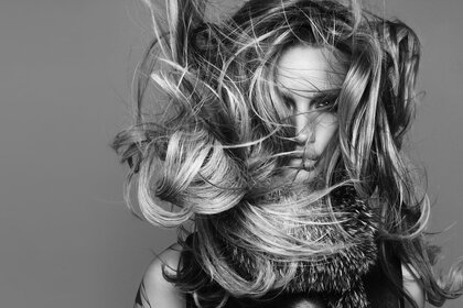 Ragazza in abito nero con fiori rossi INA sfondo enorme luna