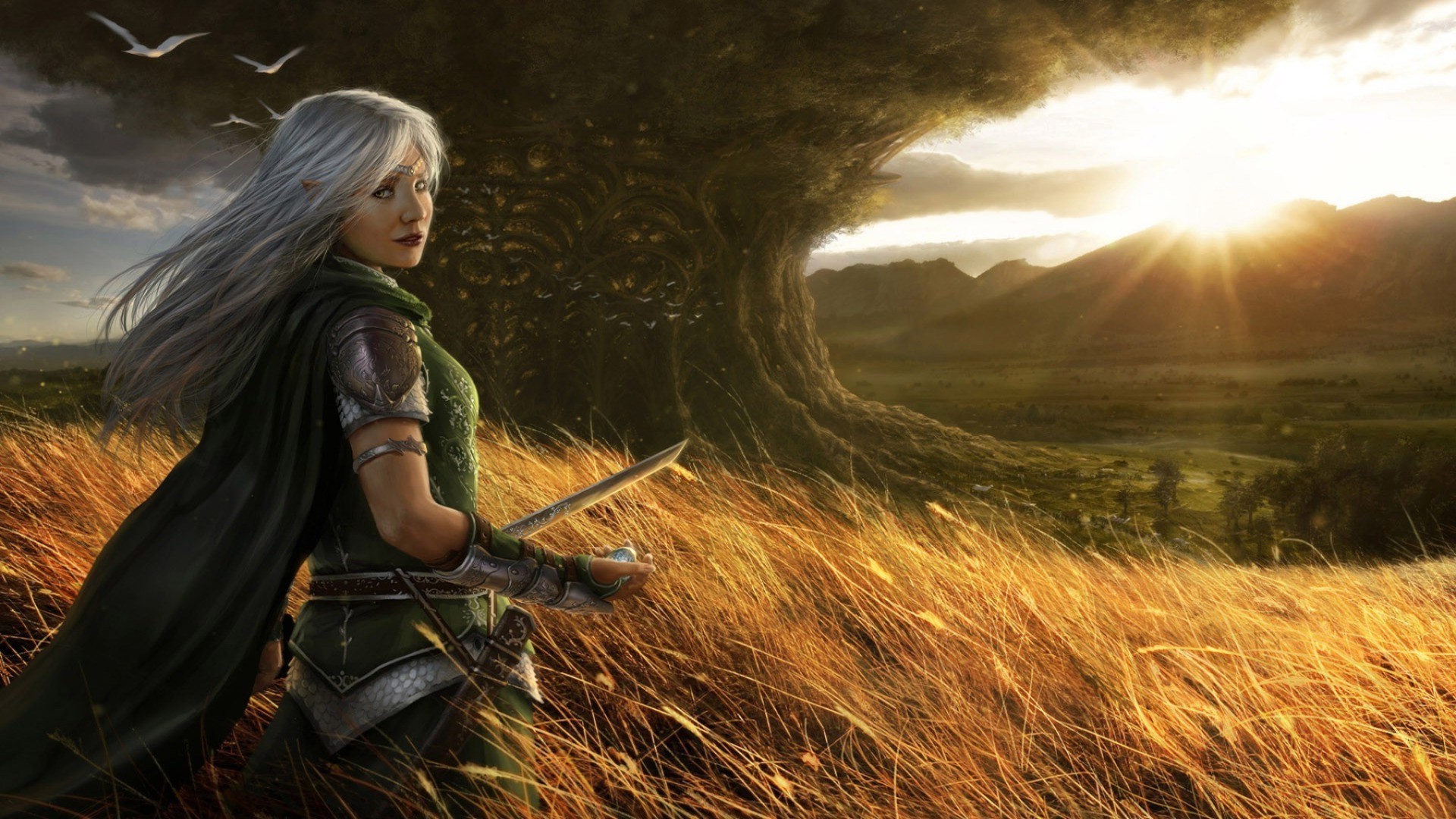 Ragazza elfo guerriero vicino all'albero