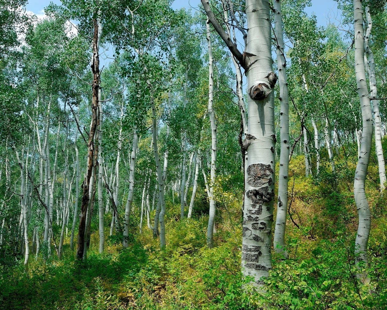 Parte della foresta di betulle e arbusti è illuminata dalla luce solare intensa
