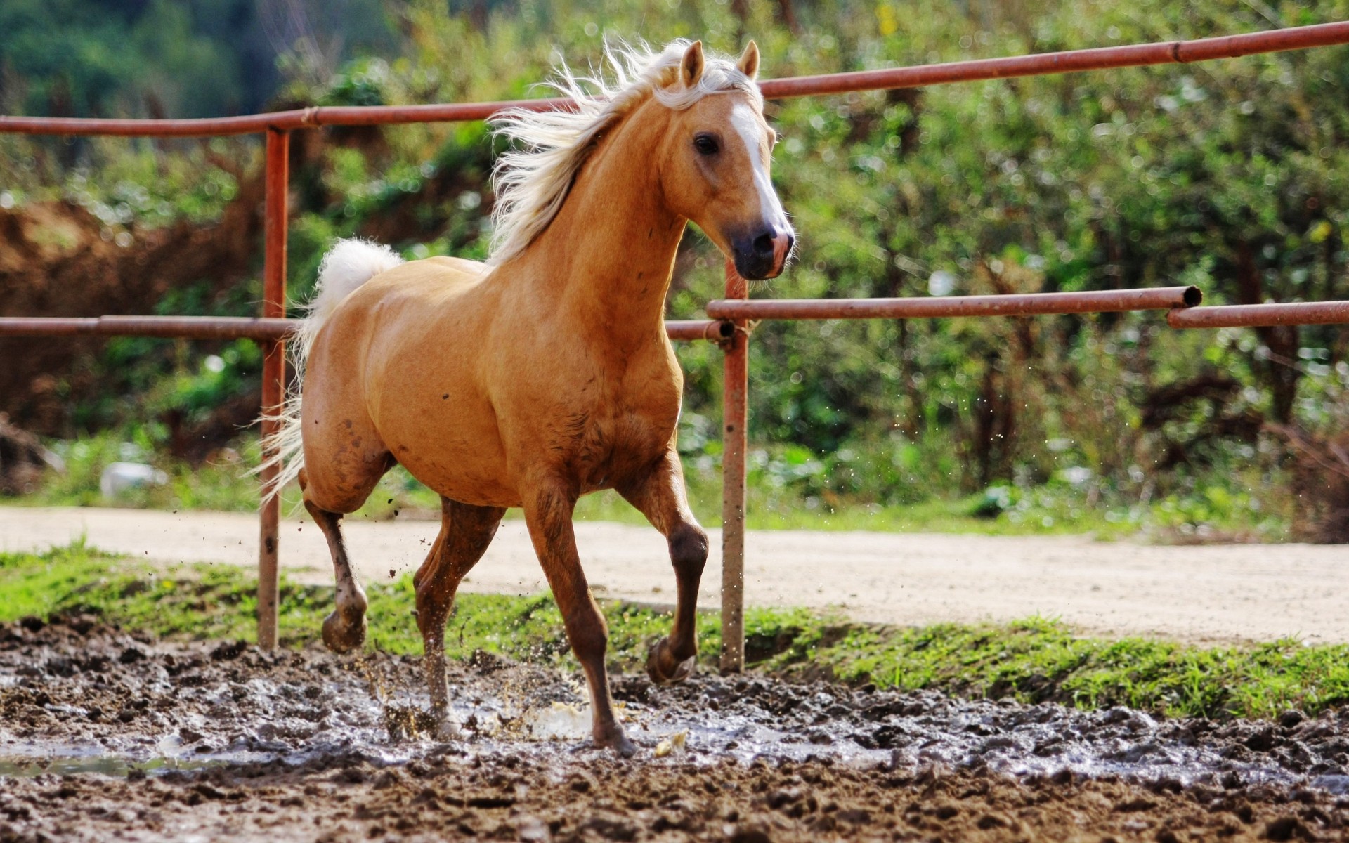 Un cavallo rosso con una macchia bianca sulla testa si trova in un recinto sul prato