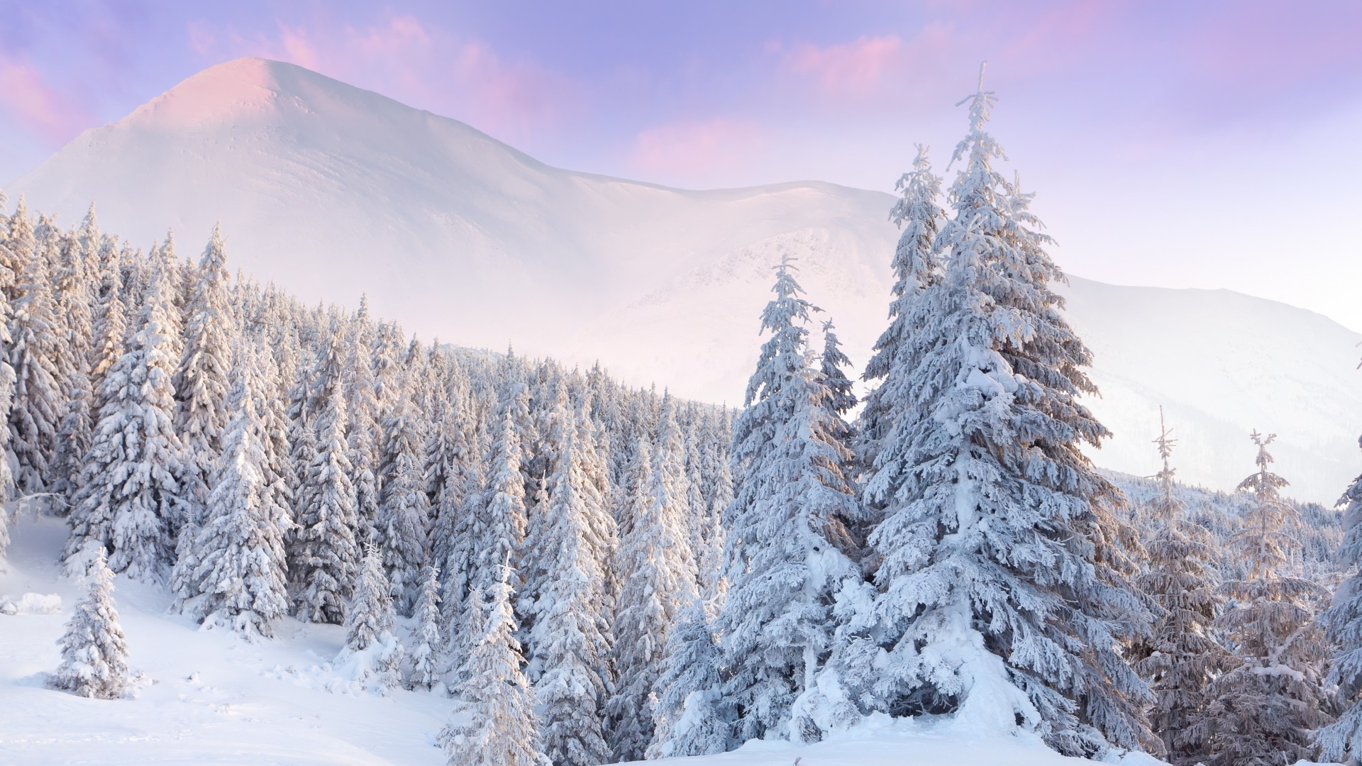Alberi di Natale induriti sono coperti di neve sul fianco della montagna