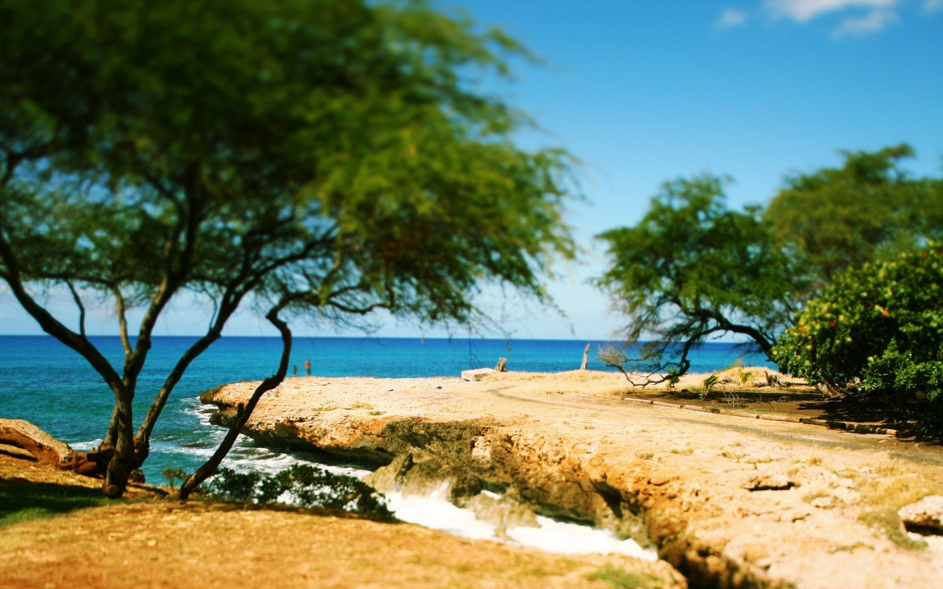 Palme, tramonto, sabbia bianca e mare in colori tenuiPalme, tramonto, sabbia bianca e mare in colori tenui