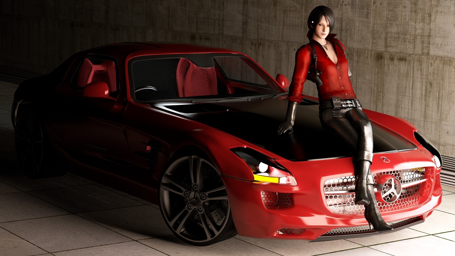 Ragazza in rosso su una macchina rossa