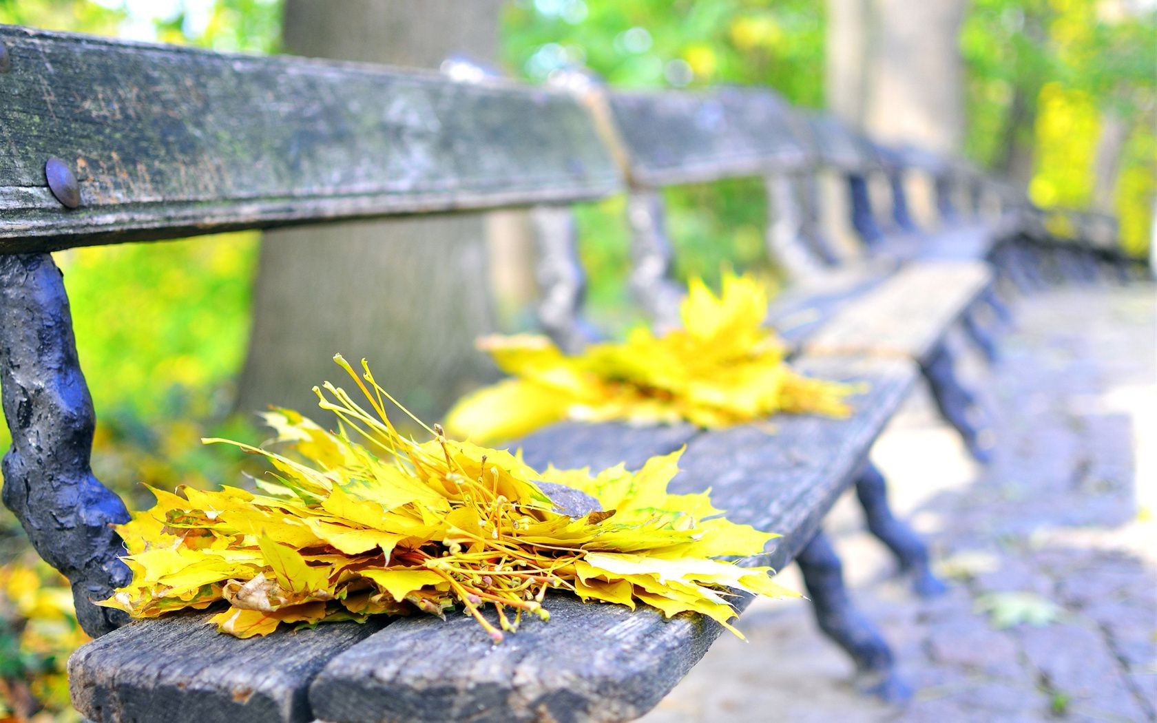 Paesaggio con panchina e tavolo nella foresta d'autunno