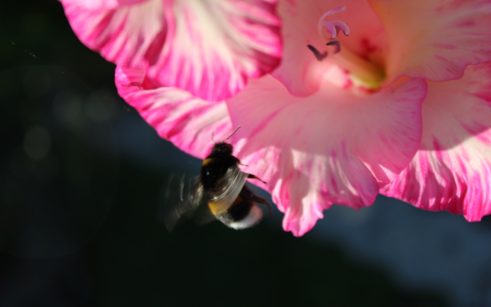 Bumblebee pesante rumoroso sul fiore di pizzo rosa