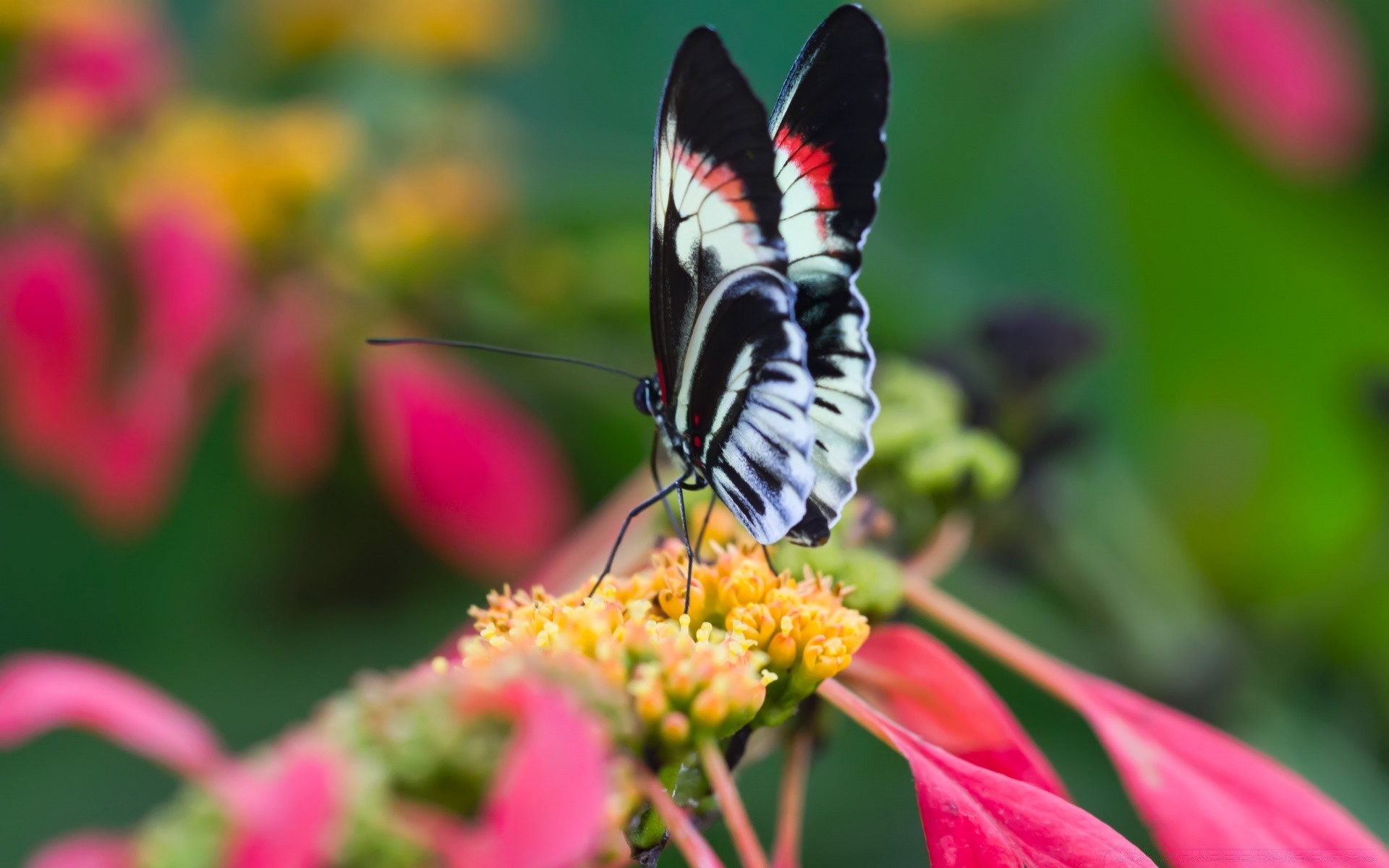 Una farfalla si siede sul fiore, lo sfondo è giallo, la natura è buona