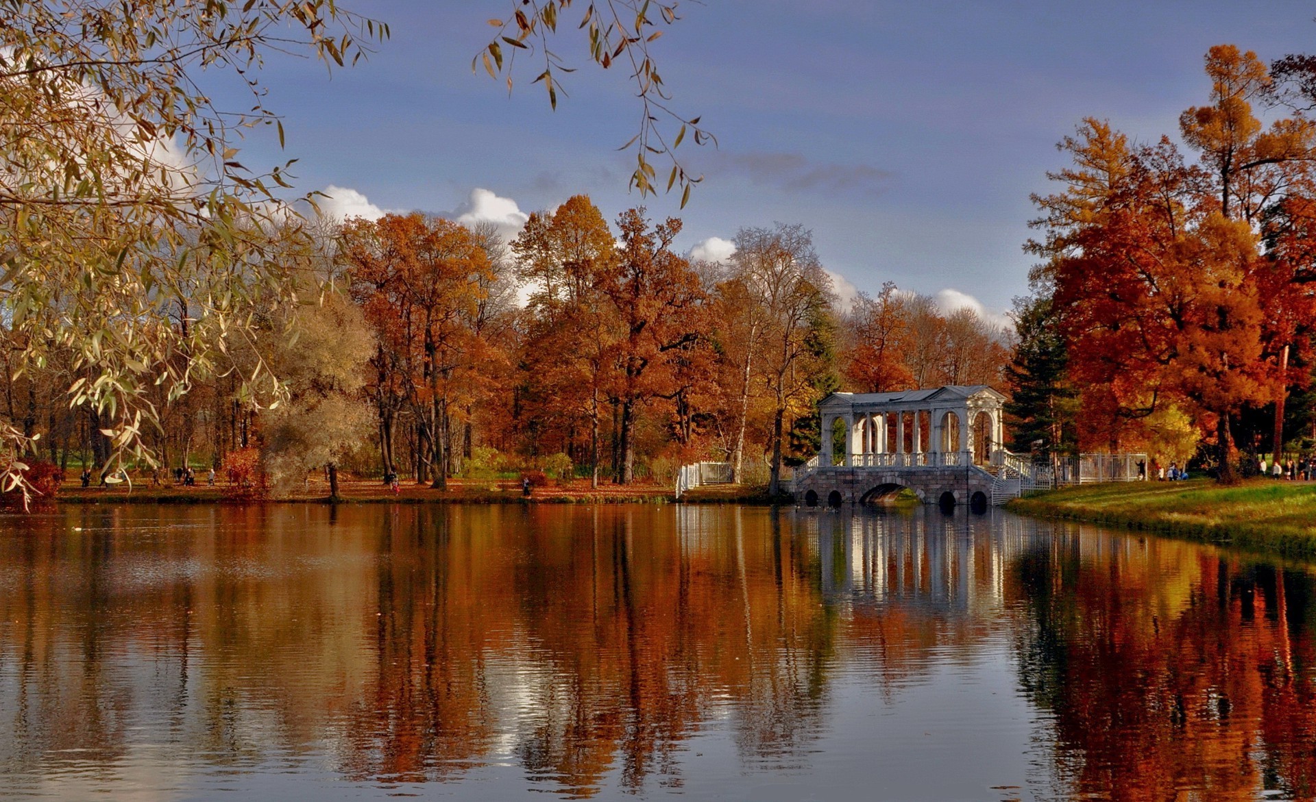 Autunno dorato, foglie gialle sugli alberi, lago grande