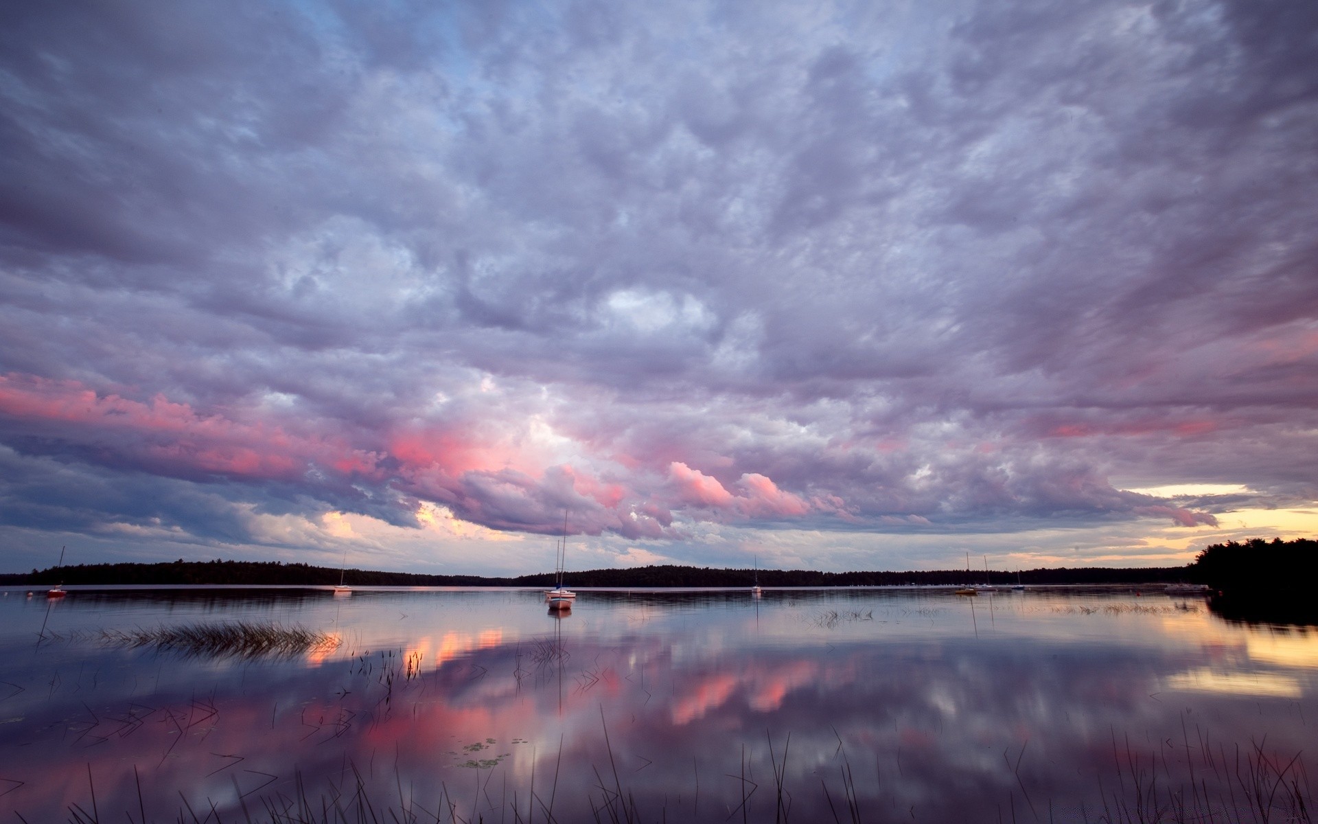 Riflessione speculare di nuvole rosa-viola nell'acquaRiflessione speculare di nuvole rosa-viola nell'acqua