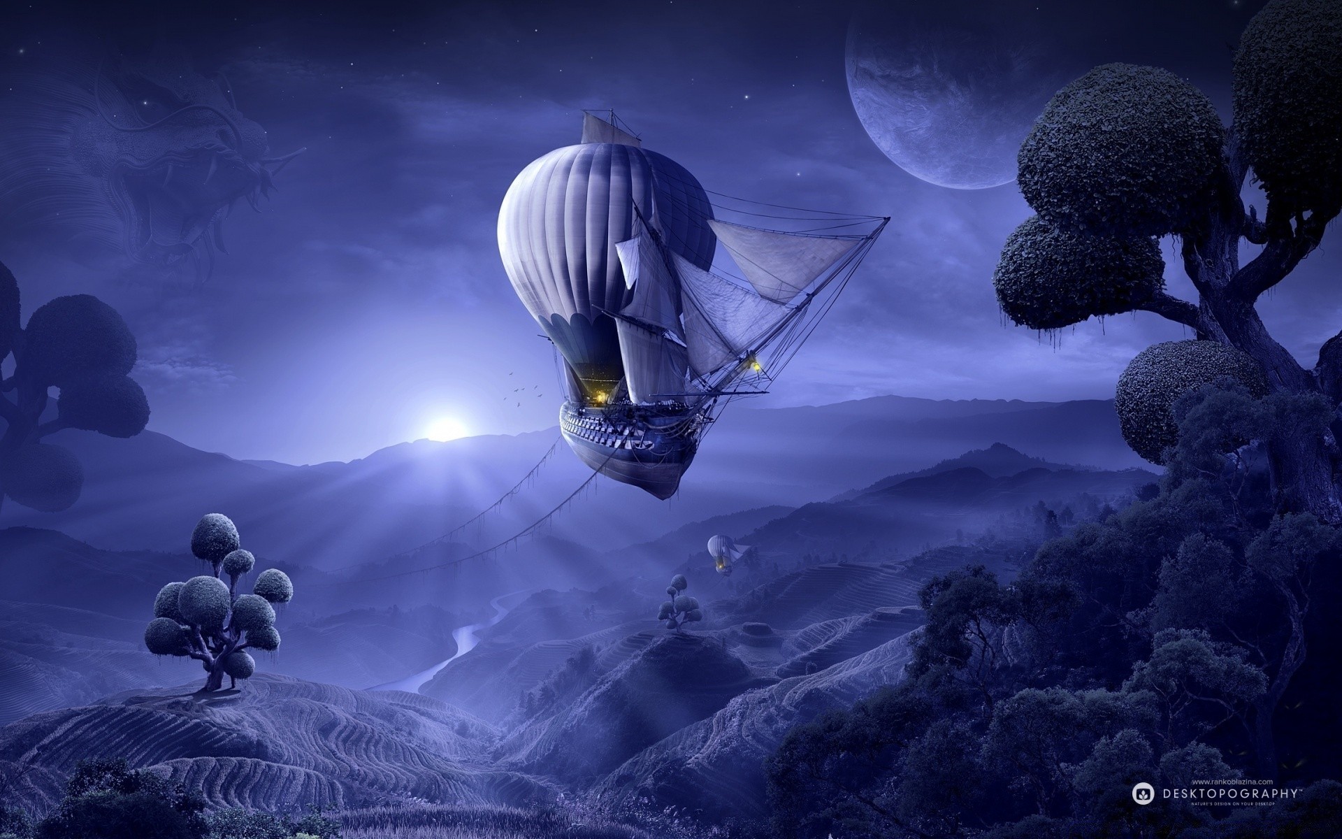 Immagine di una nave volante al tramonto