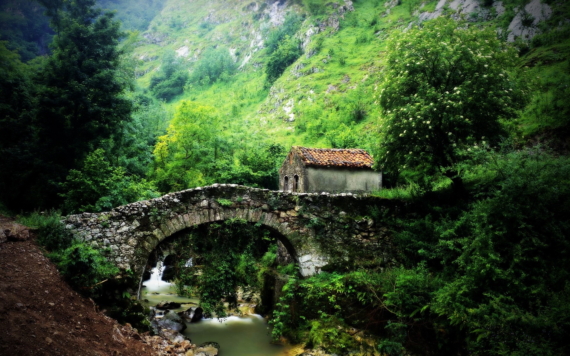Casetta vicino al ponte e alle colline