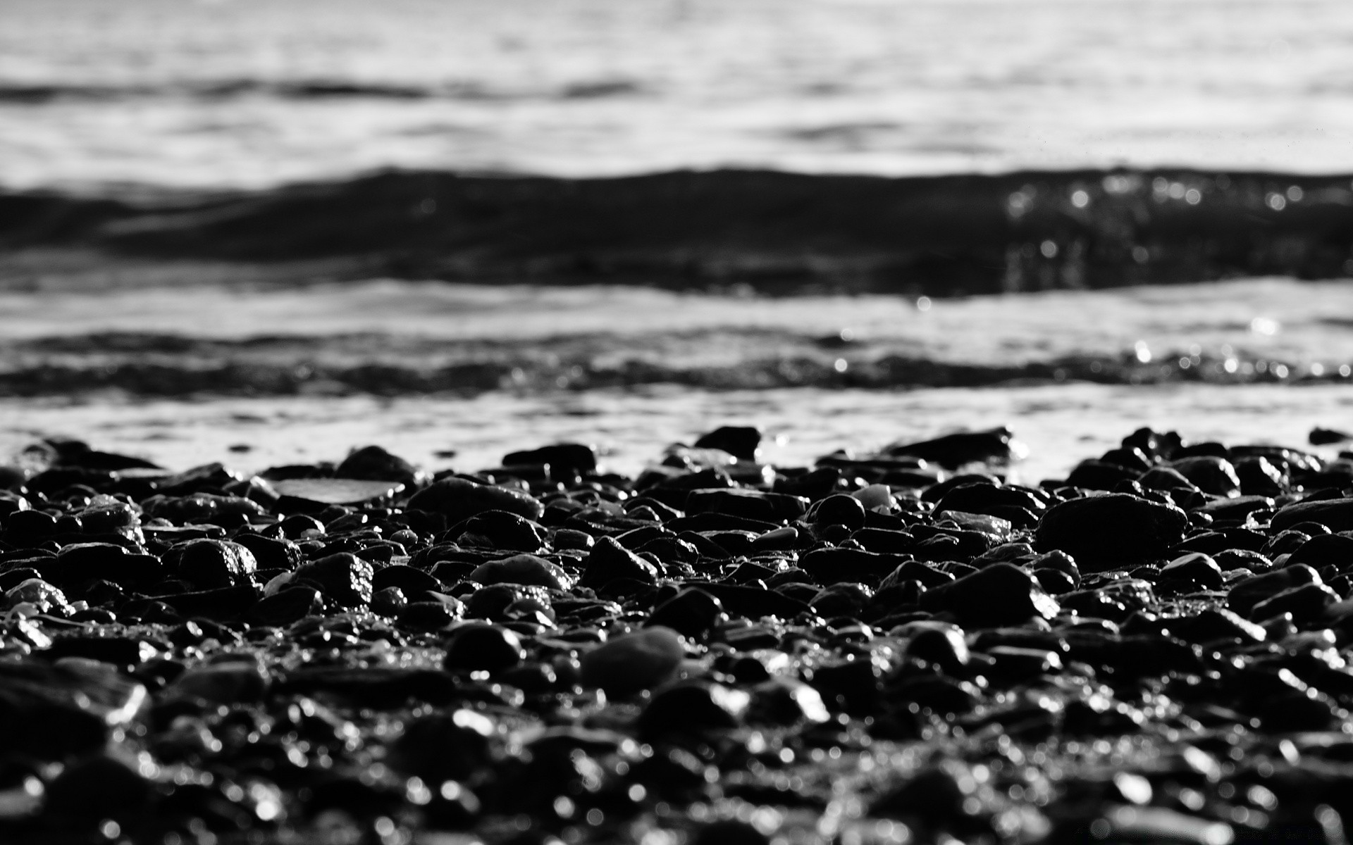 Spiaggia di ciottoli e surf tranquillo paesaggio bianco e nero