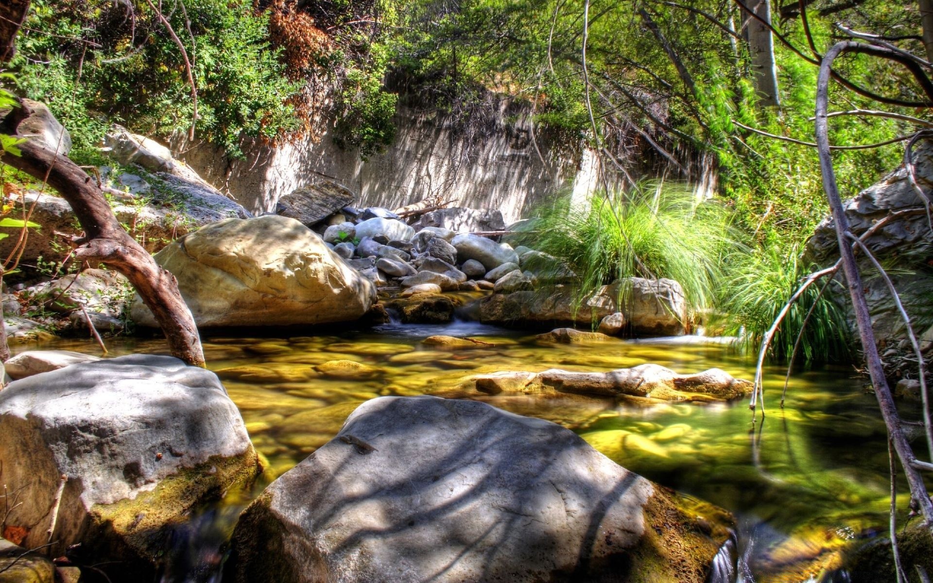 Acqua che scorre attraverso le rocce, sullo sfondo del tramonto