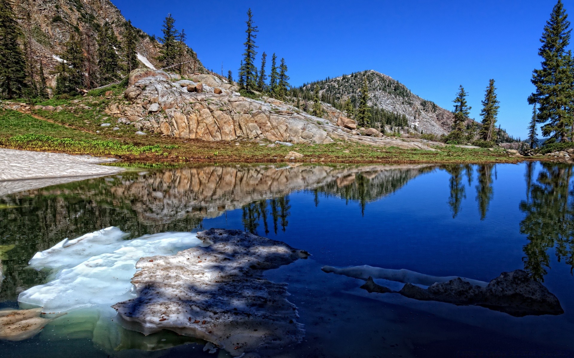 Lago di montagna trasparente sullo sfondo di rocce di pietra e alberi