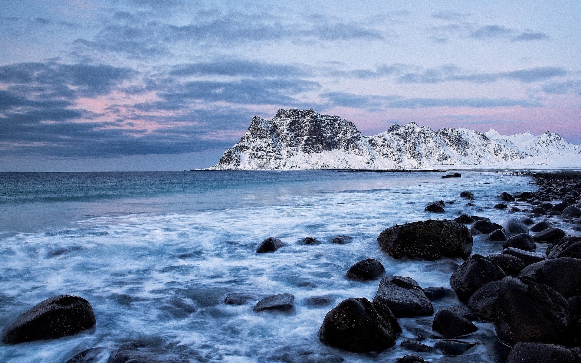 Colori sorprendentemente luminosi di un paesaggio con rocce e mare al tramontoColori sorprendentemente luminosi di un paesaggio con rocce e mare al tramonto