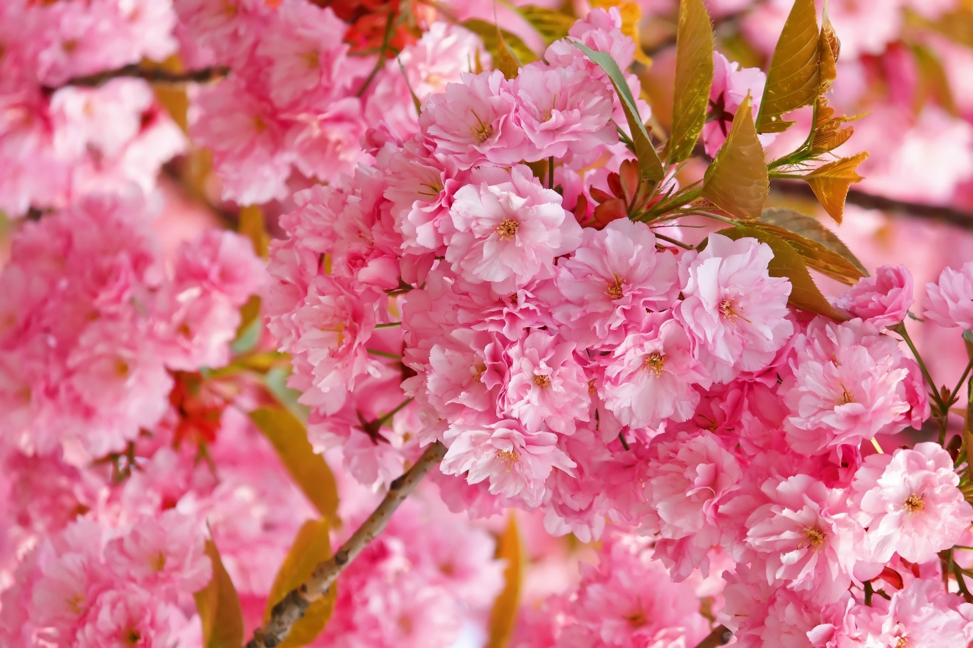 Closeup di fiori rosa-arancio di un albero da frutto in primavera
