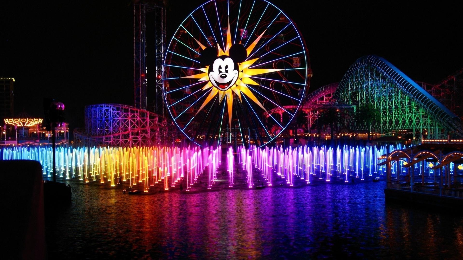 Ruota panoramica con immagine di miki mouse sullo sfondo di fontaneRuota panoramica con immagine di Miki mouse sullo sfondo di fontane