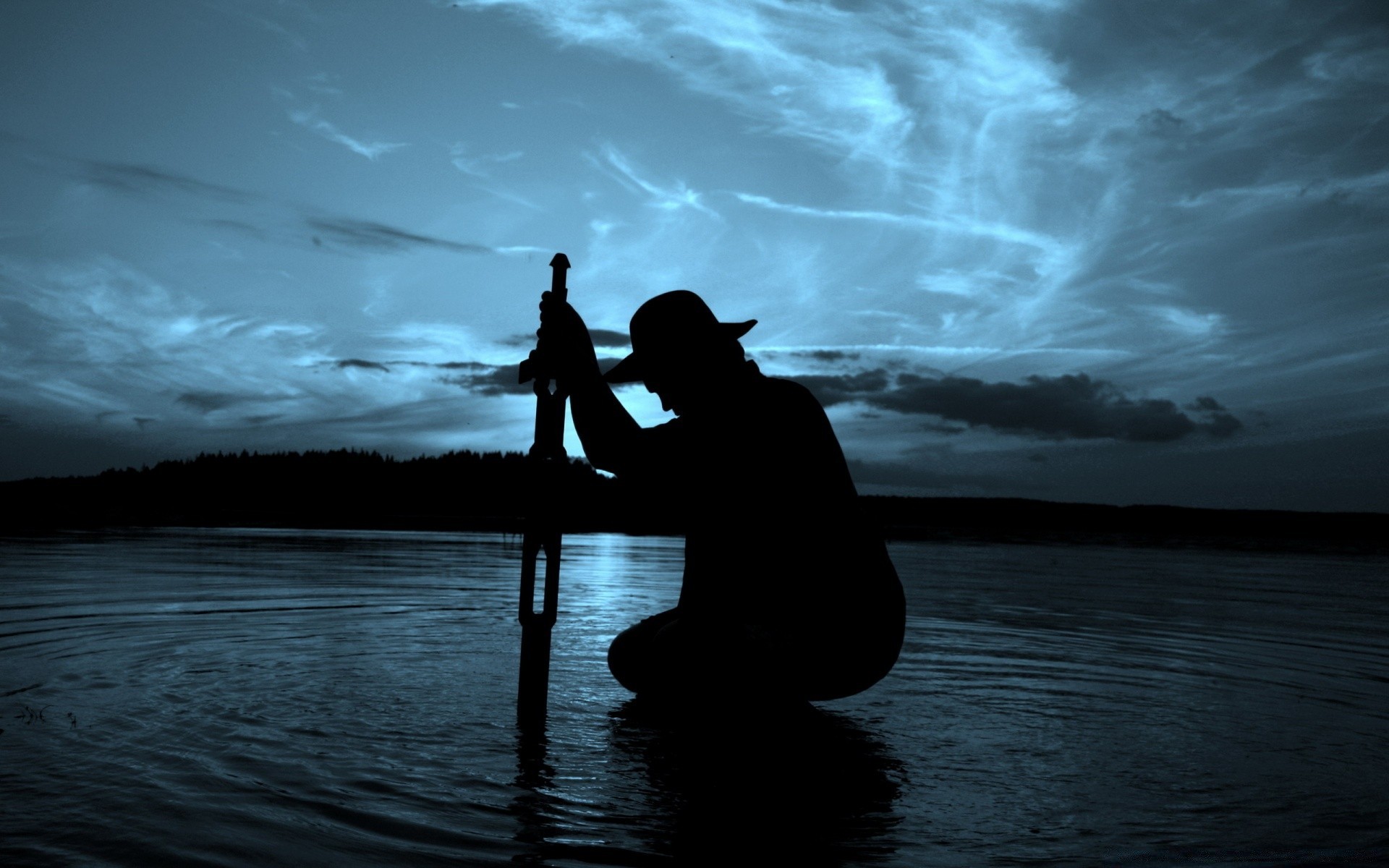 Sagoma di un uomo in un cappello su uno sfondo di acqua e cielo