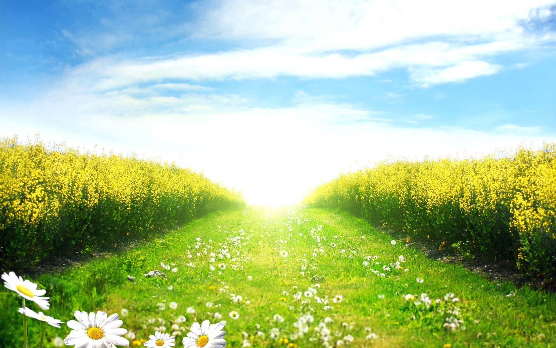 Paesaggio estivo luminoso con margherite