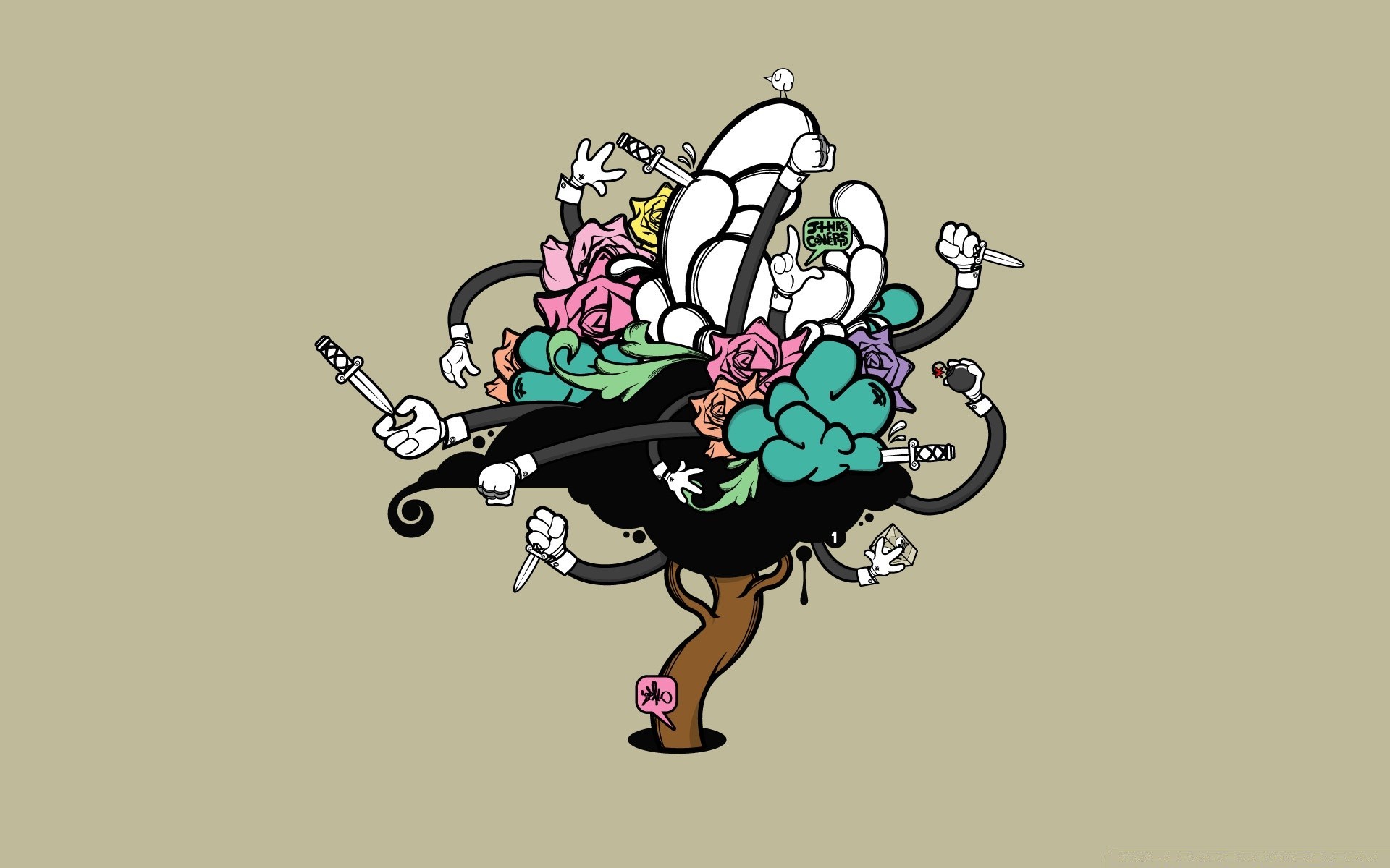 Illustrazione sotto forma di una volpe, un uccello e una mano femminile