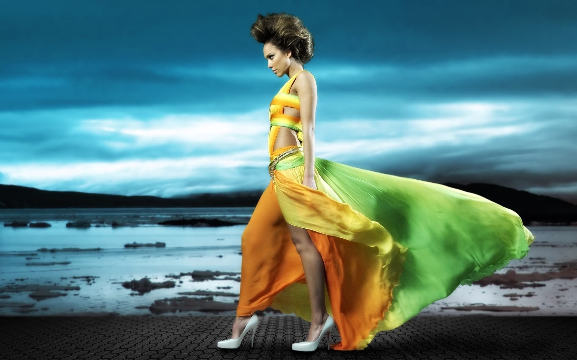 Donna in abbigliamento luminoso sulla spiaggia di mareDonna in abbigliamento luminoso sulla spiaggia di mare