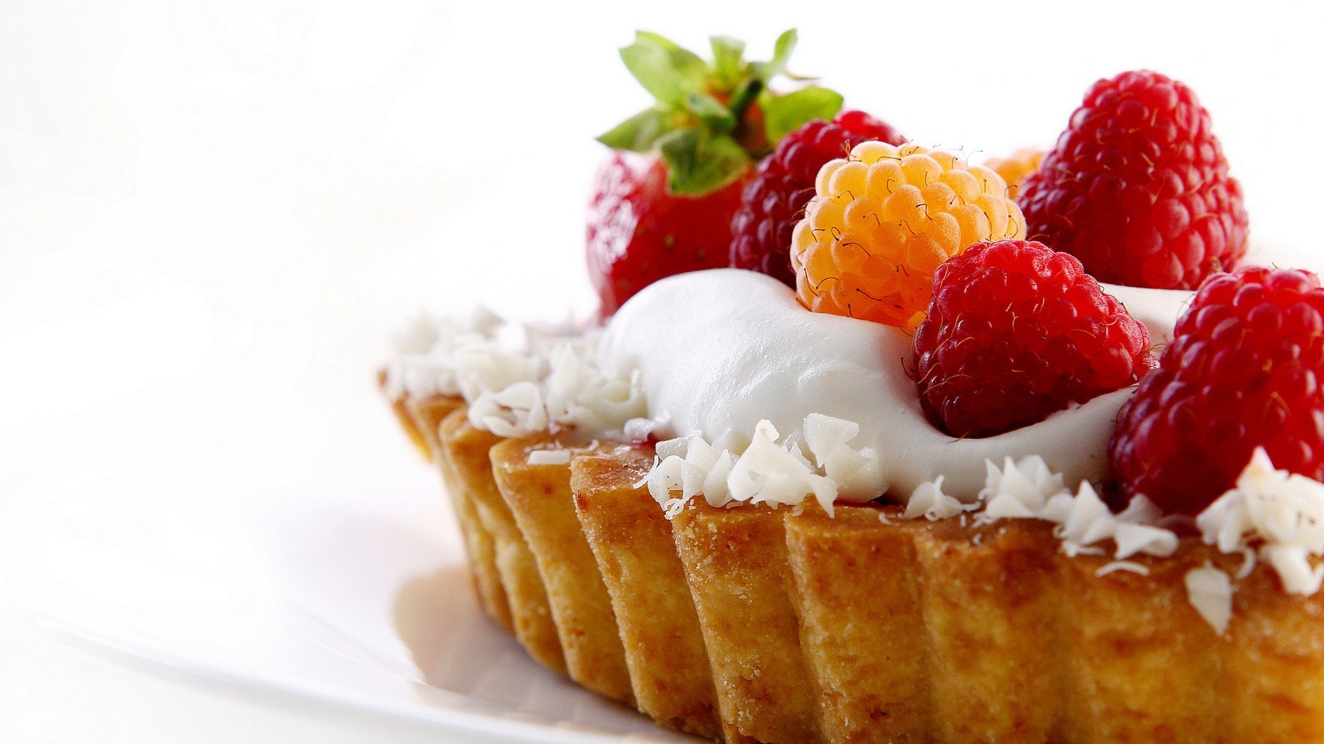 Dolce arioso e delicato con crema leggera e bacche cosparse di scaglie di cocco