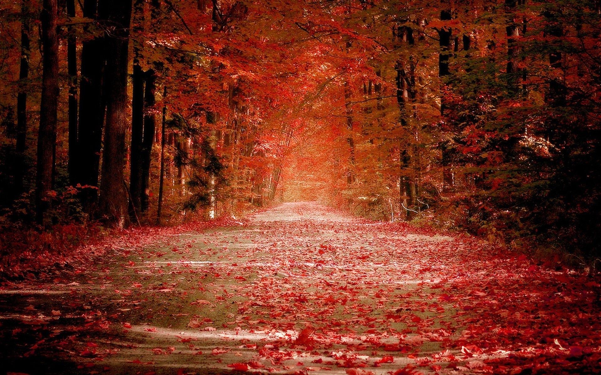 Strada nella foresta d'autunno e caduta delle foglie rosseStrada nella foresta d'autunno e caduta delle foglie rosse