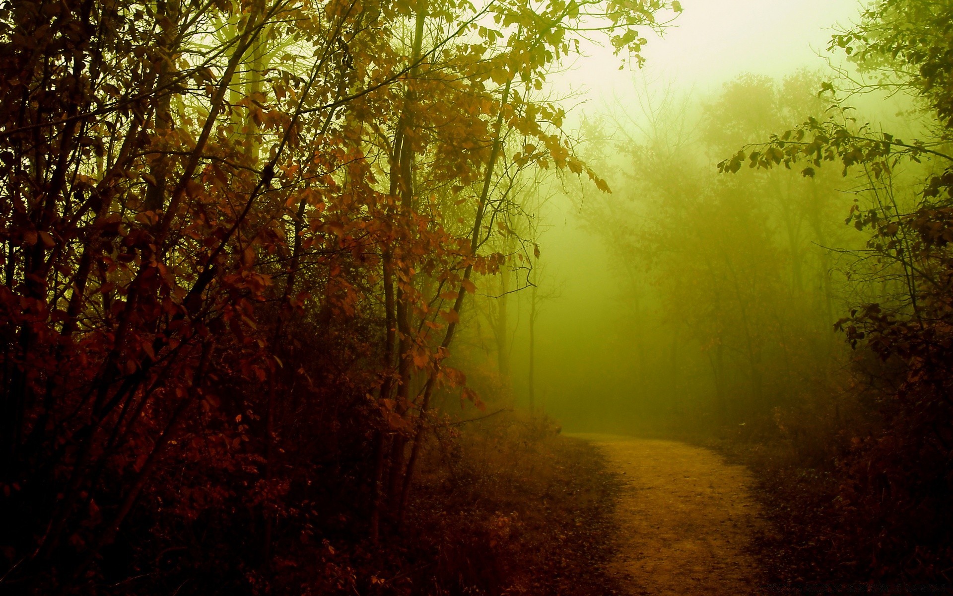 Nebbia mistica nella foresta della sera