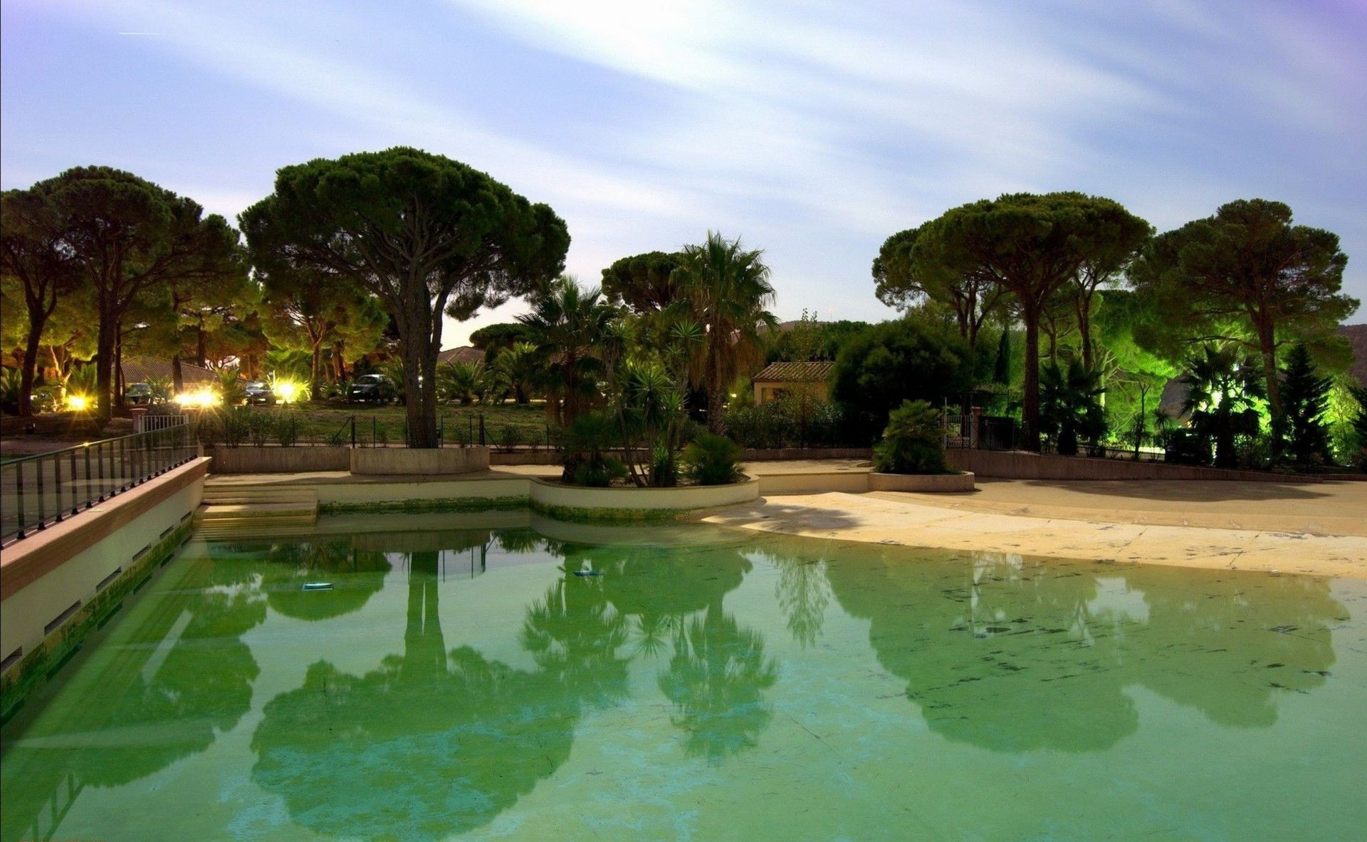Paesaggio del parco tropicale con piscina verde