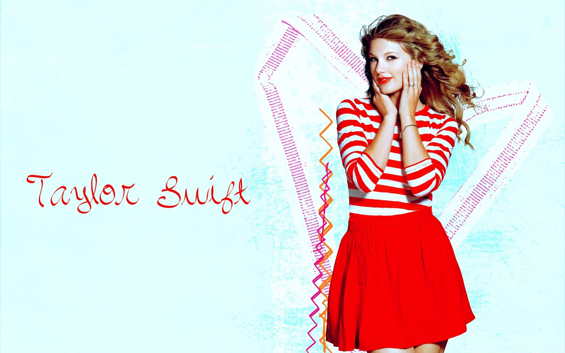 Su sfondo blu bionda in abito rosso e lettere inglesi