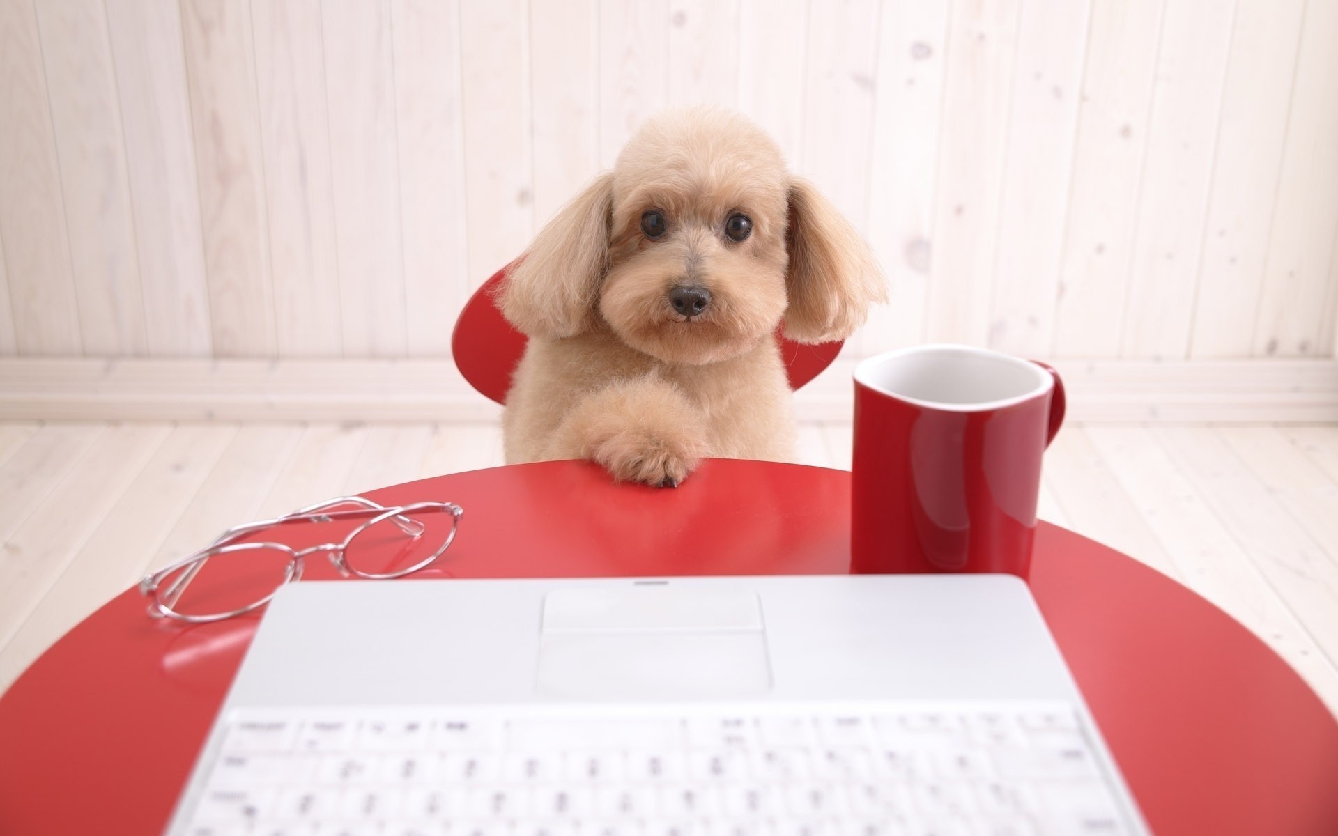 Cane dalle orecchie lunghe con una tazza di caffè sul computer portatileCane dalle orecchie lunghe con una tazza di caffè sul computer portatile