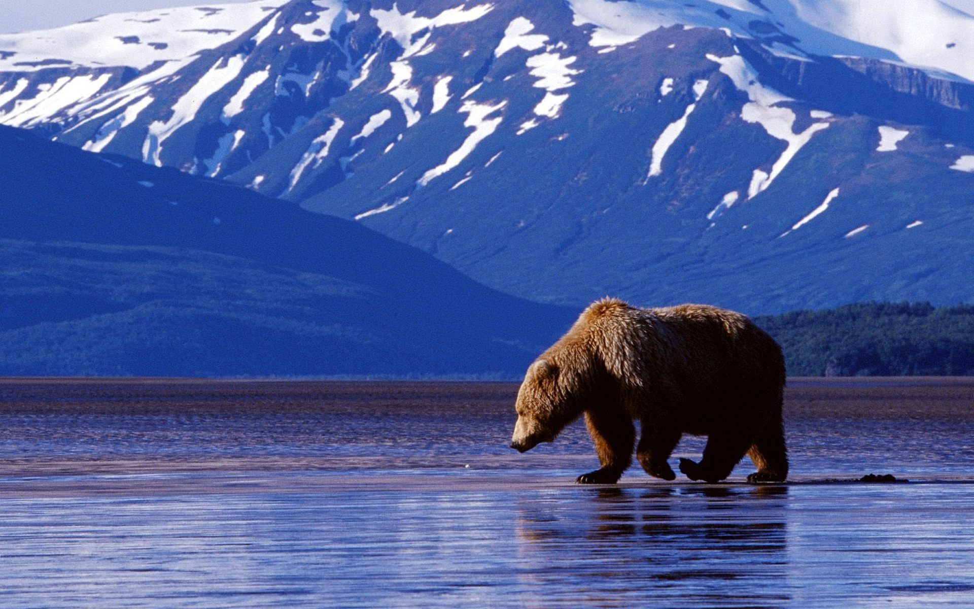 Orso sullo sfondo di montagne innevate e distese d'acqua