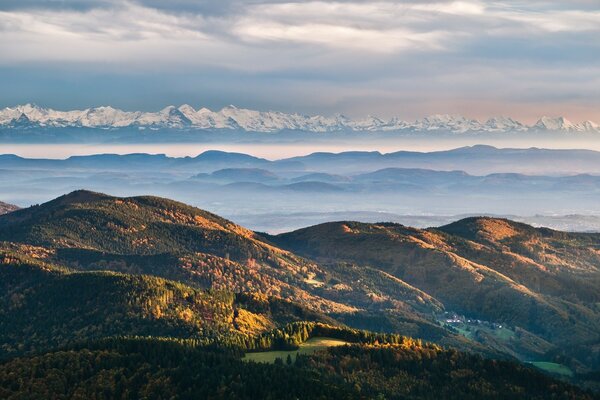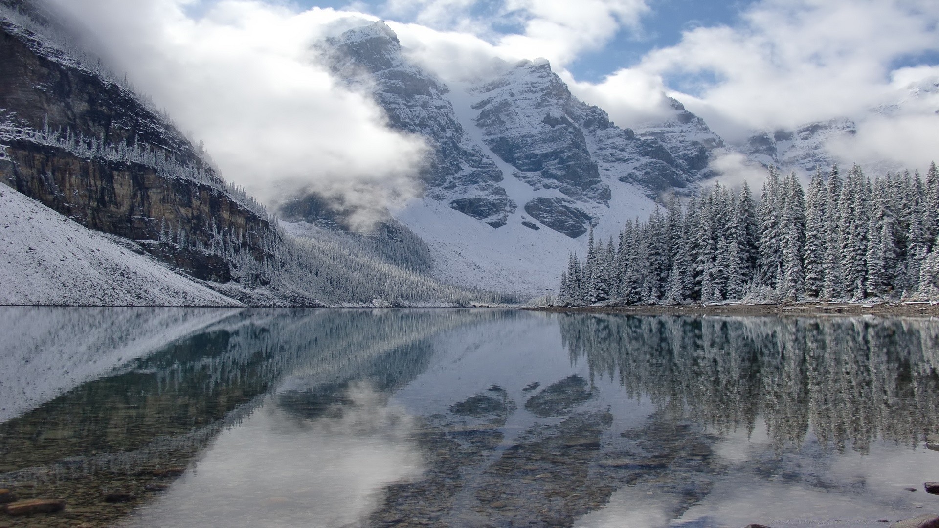 Lago sullo sfondo di un paesaggio montano innevatoLago sullo sfondo di un paesaggio montano innevato