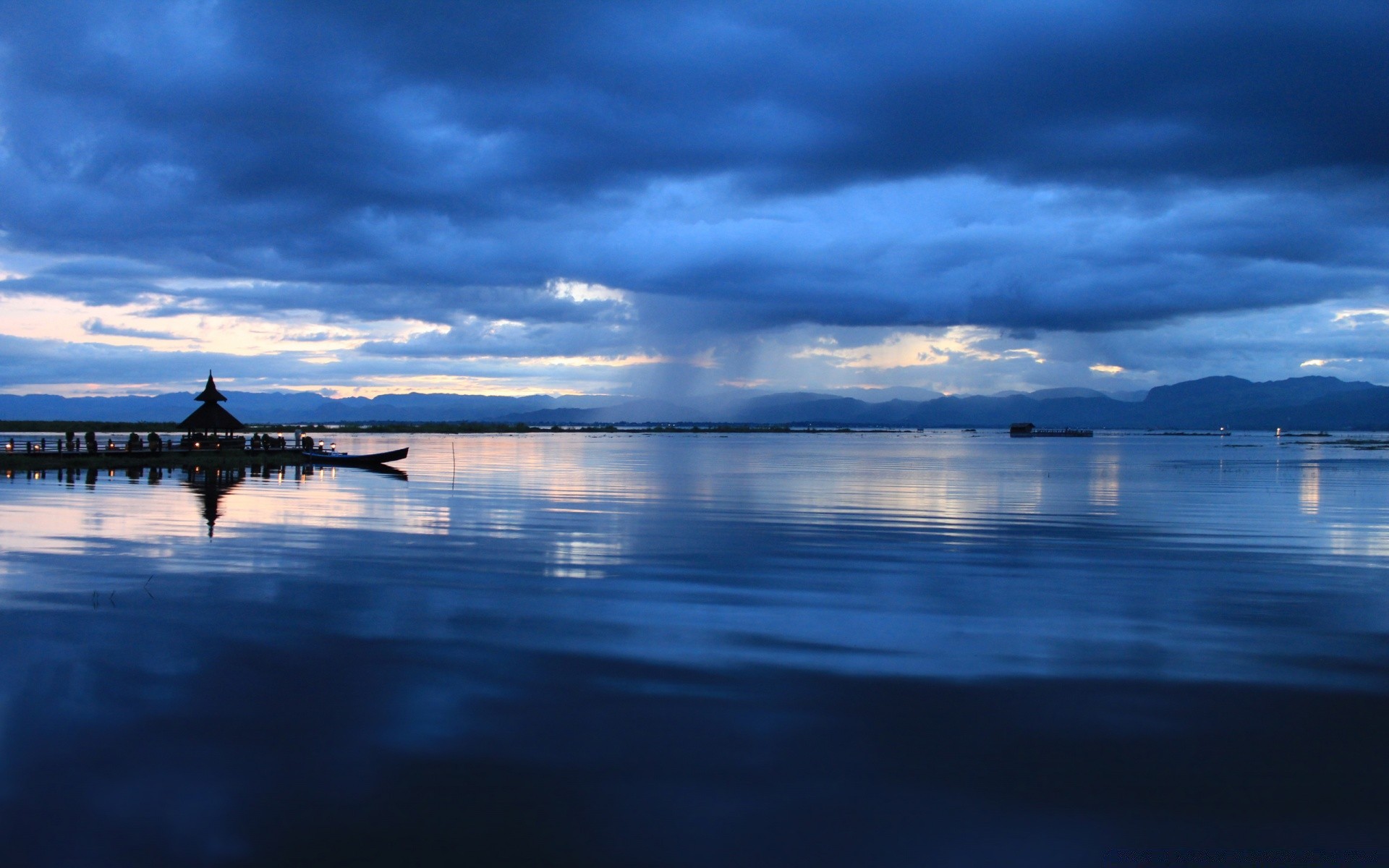 Il cielo nuvoloso della sera si riflette nell'acqua