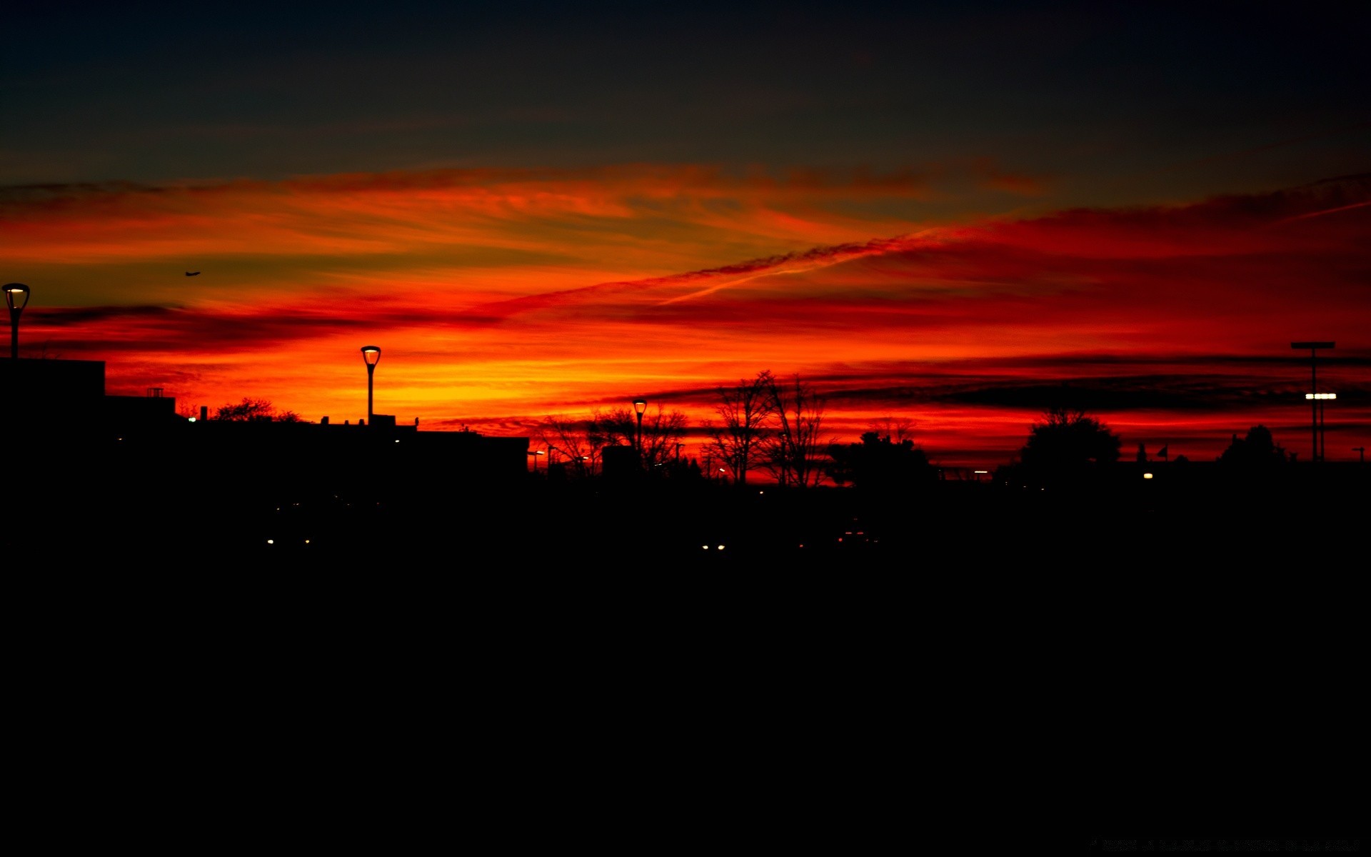Il tramonto si nasconde dietro i tetti scuri delle case in un luminoso cielo arancione