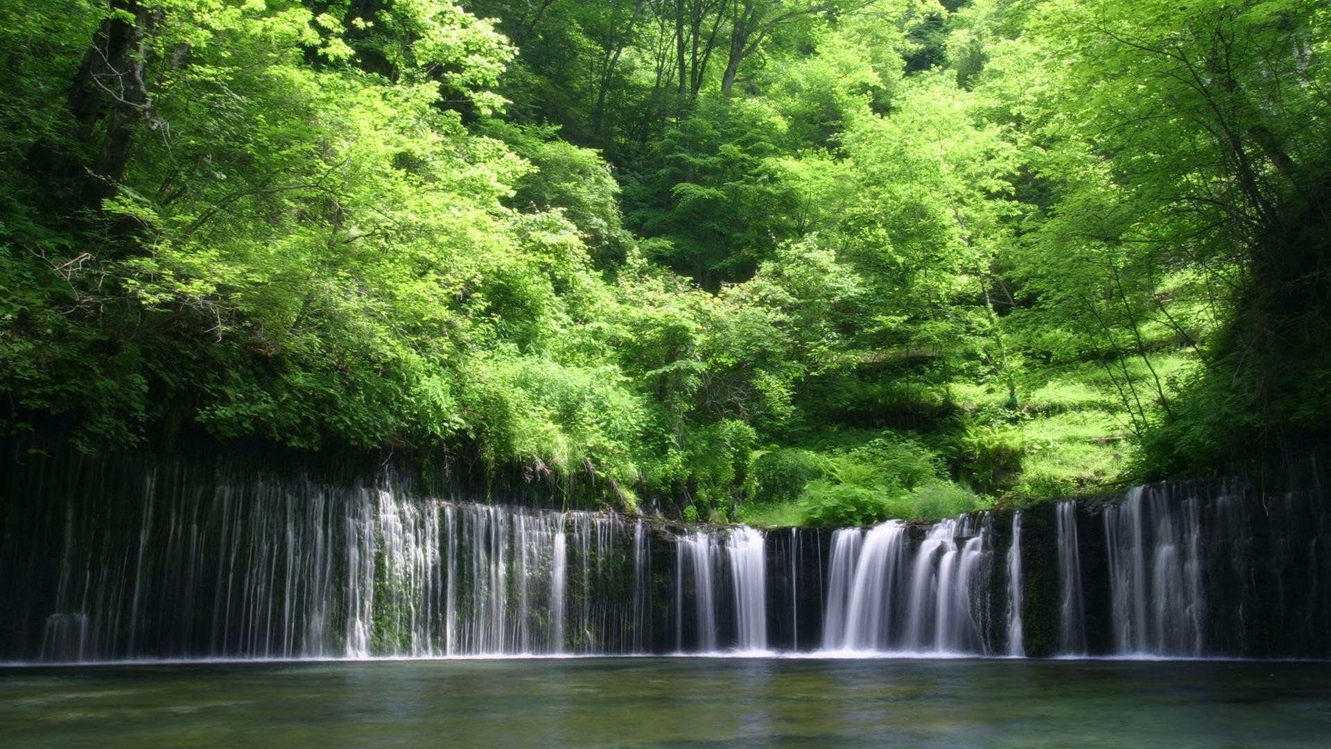 La cascata sfocia nel fiume sullo sfondo degli alberi autunnali