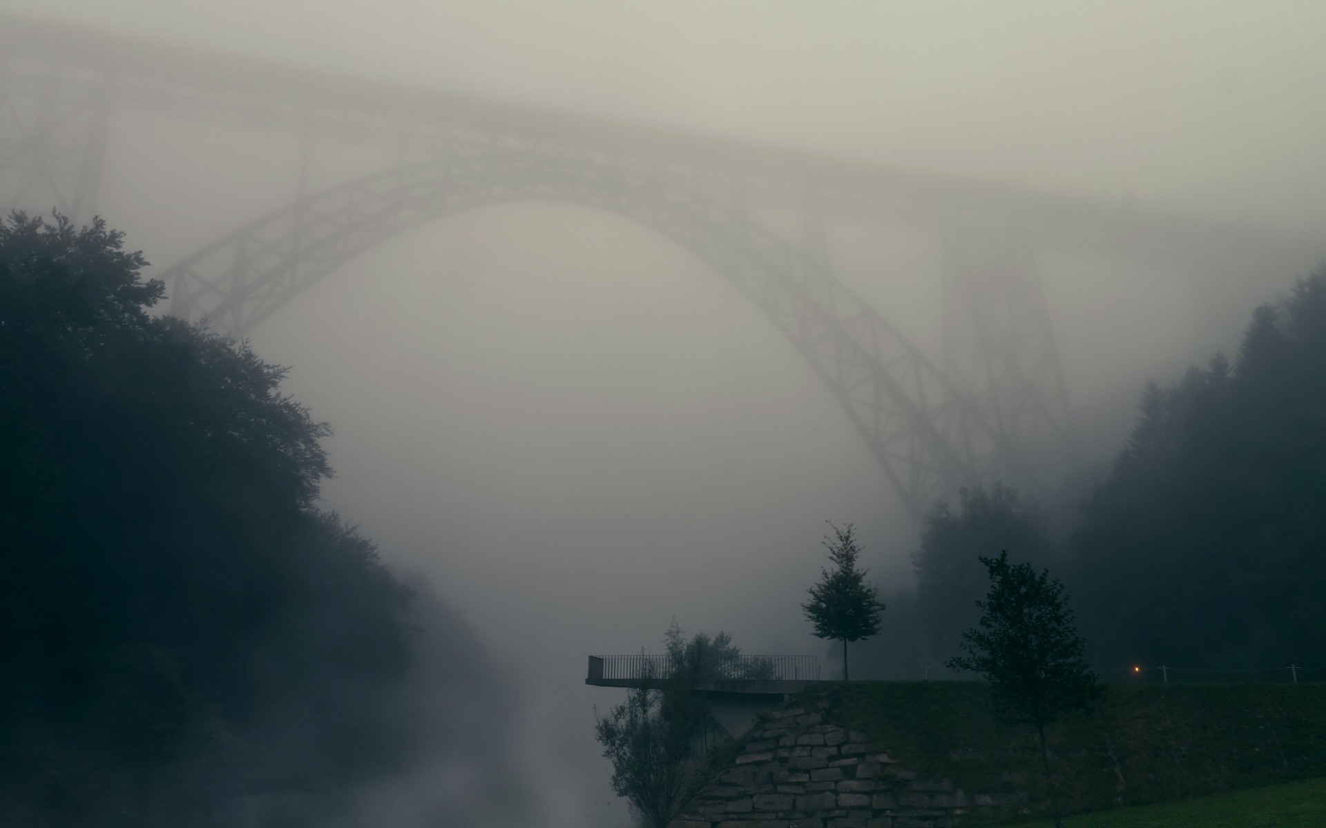 Ponte nella nebbia all'alba Paesaggio
