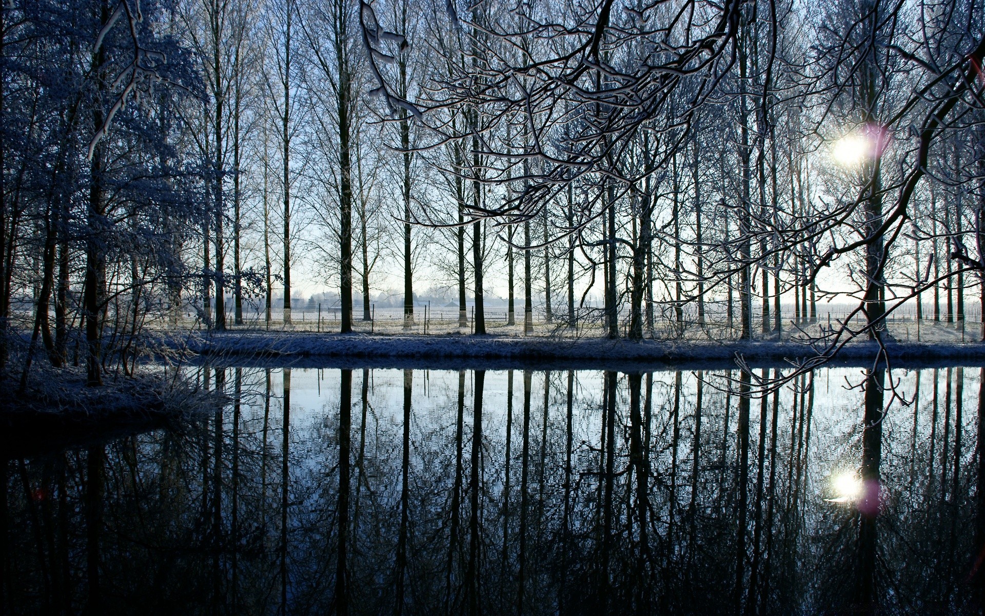 Riflesso del sole attraverso gli alberi in uno stagnoRiflesso del sole attraverso gli alberi in uno stagno