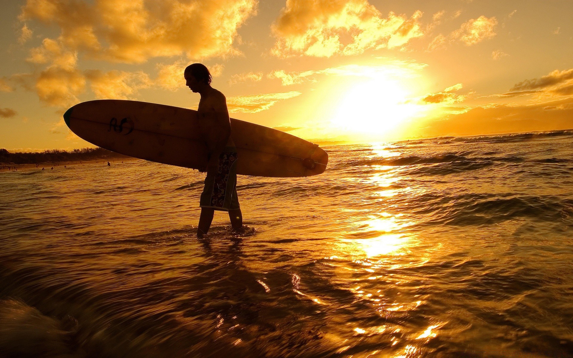 Surfista con una tavola che emerge dall'oceano sullo sfondo del sole al tramontoSurfista con una tavola che emerge dall'oceano sullo sfondo del sole al tramonto