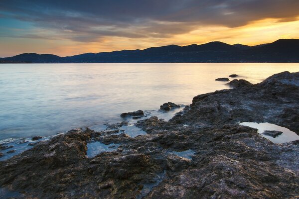 Foto in bianco e nero dell'acqua del mare con la spiaggia sullo sfondo del tramontoFoto in bianco e nero dell'acqua del mare con la spiaggia sullo sfondo del tramonto