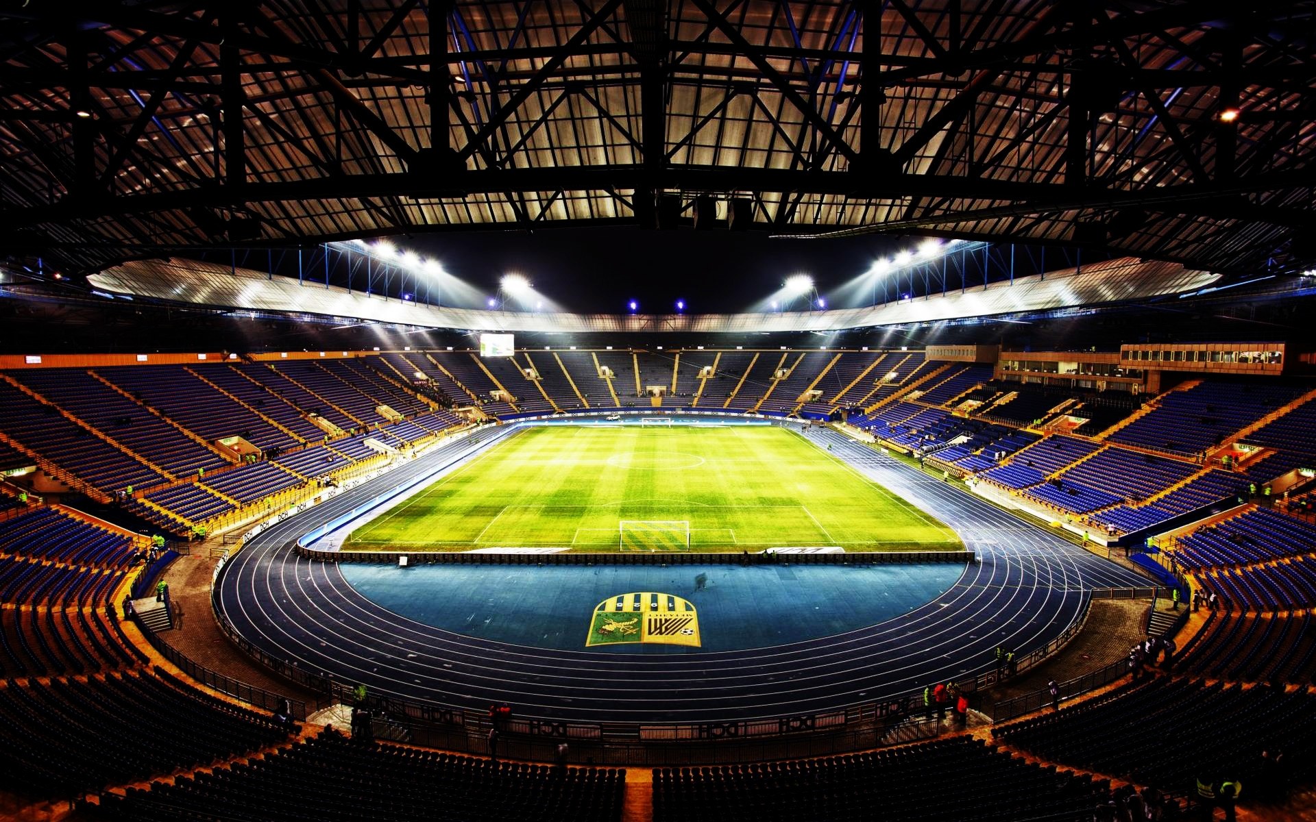 Simboli del campione del mondo di calcio sullo sfondo dello stadio