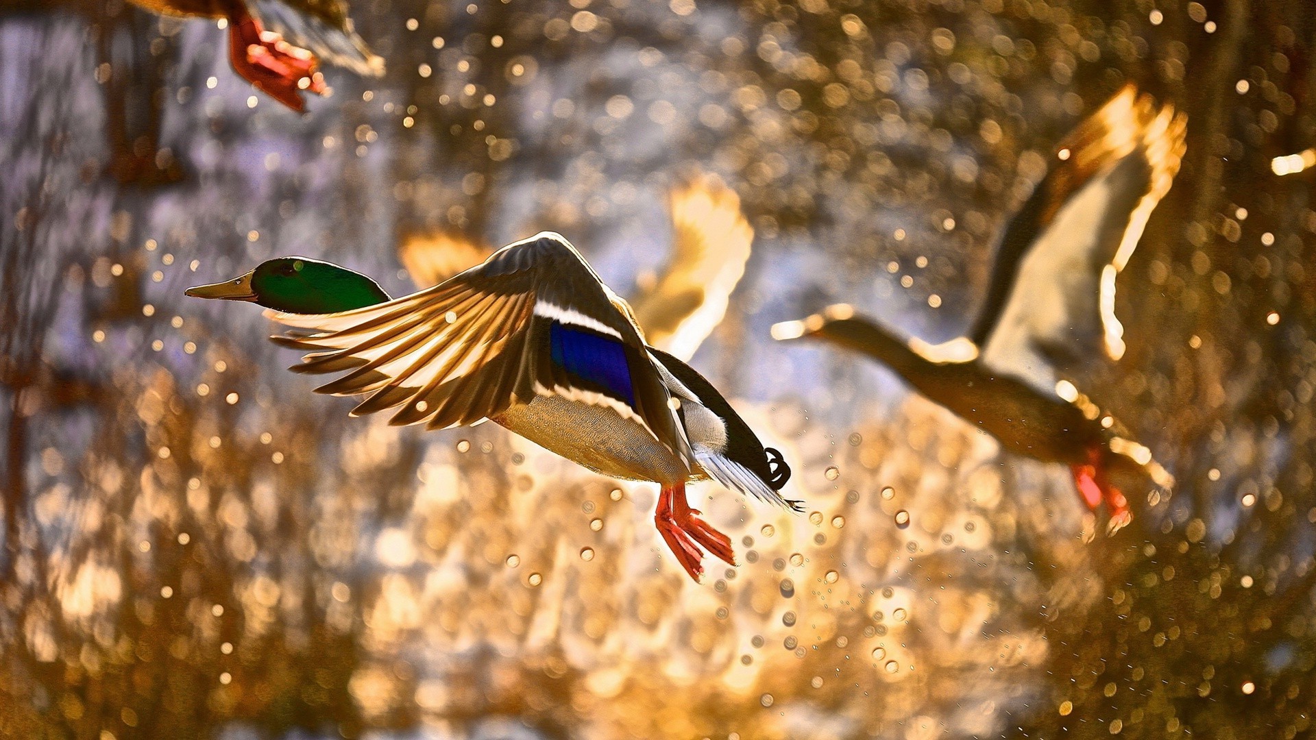 Un'anatra grigia dal collo verde Decolla. Spruzzi d'acqua