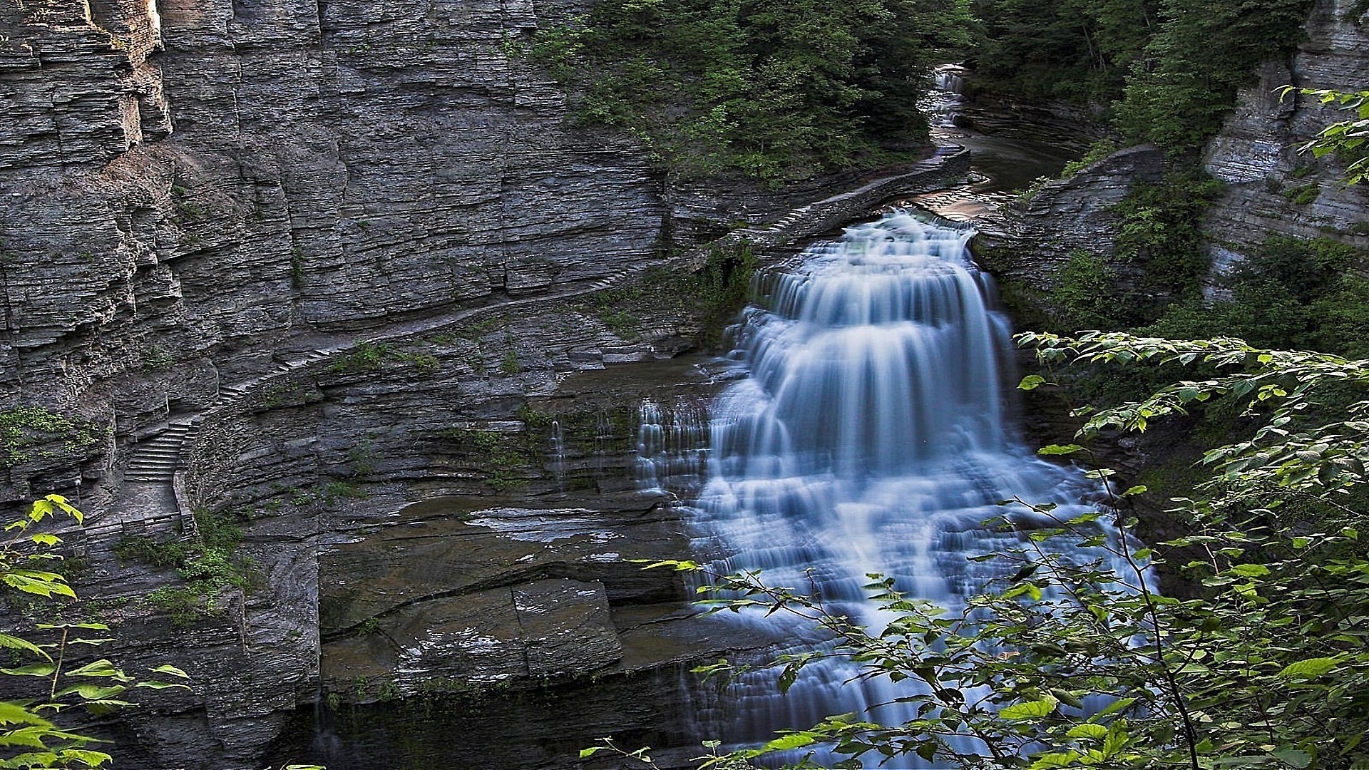 L'acqua limpida scorre lungo il fiume veloce di montagna